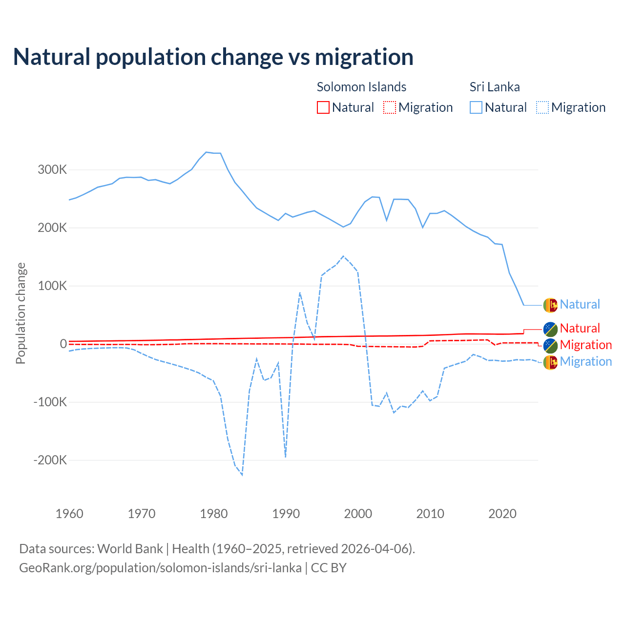 Over the last 10 years, 82.8% of the population change in the Solomon Islands is from natural causes (a gain of 168,727 people) and 17.2% is from migration (a gain of 35,031 people). In Sri Lanka 85.3% is from natural causes (a gain of 1,605,749 people) and 14.7% is from migration (a loss of 276,121 people).
