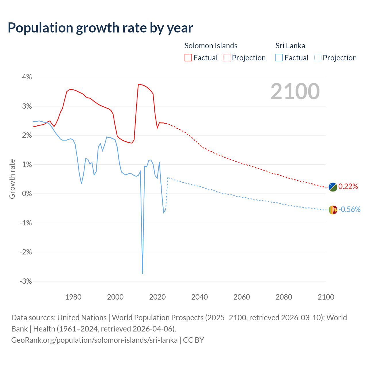 - For the last 10 years, the Solomon Islands has had an average growth rate of +2.95% per year vs +0.57% in Sri Lanka.