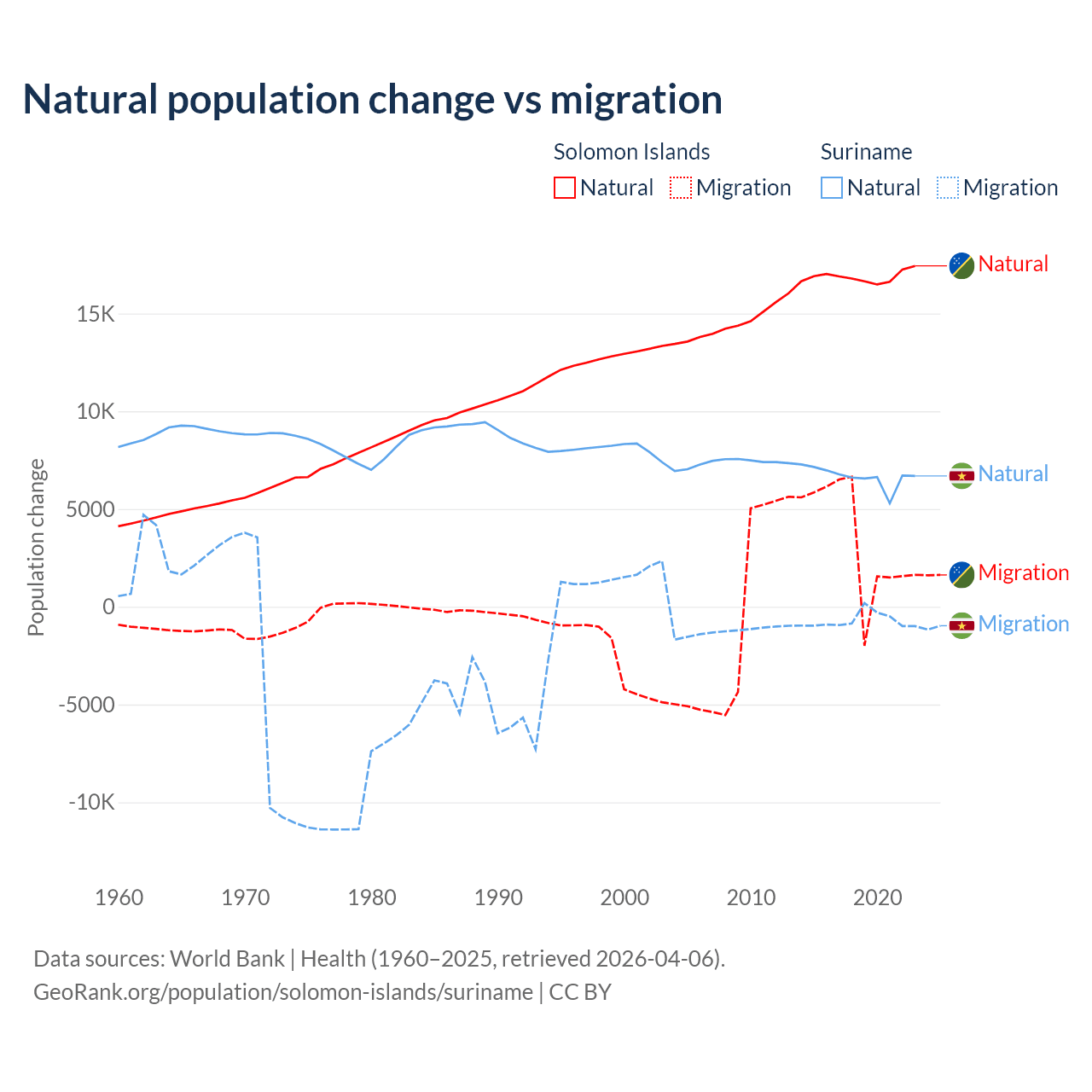 Over the last 10 years, 82.8% of the population change in the Solomon Islands is from natural causes (a gain of 168,727 people) and 17.2% is from migration (a gain of 35,031 people). In Suriname 90.3% is from natural causes (a gain of 66,709 people) and 9.72% is from migration (a loss of 7,185 people).