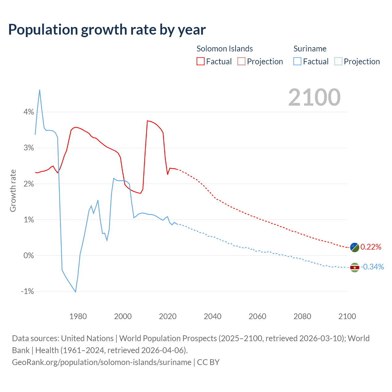 - For the last 10 years, the Solomon Islands has had an average growth rate of +2.95% per year vs +0.99% in Suriname.