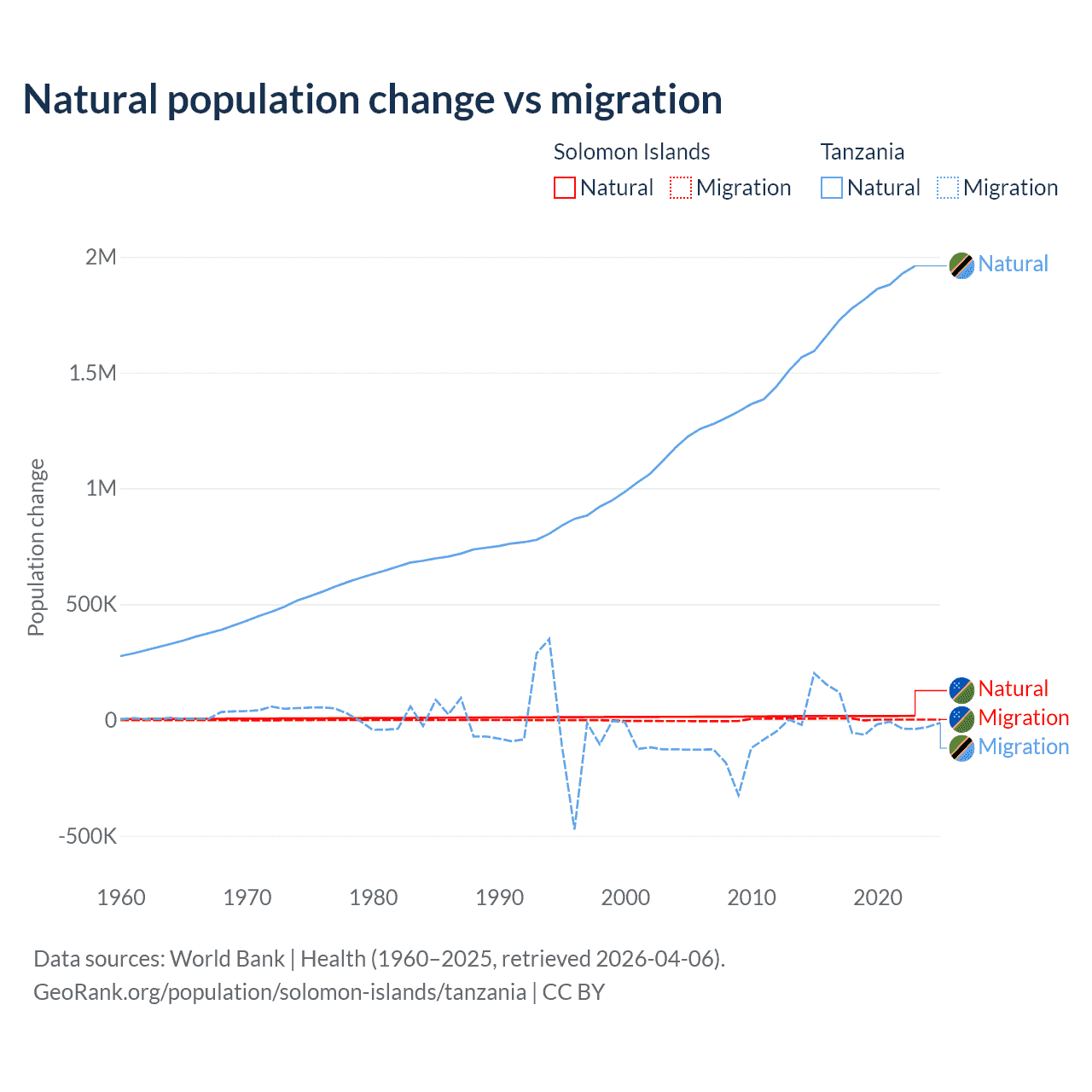 Over the last 10 years, 82.8% of the population change in the Solomon Islands is from natural causes (a gain of 168,727 people) and 17.2% is from migration (a gain of 35,031 people). In Tanzania 98.7% is from natural causes (a gain of 17,769,541 people) and 1.27% is from migration (a gain of 229,466 people).