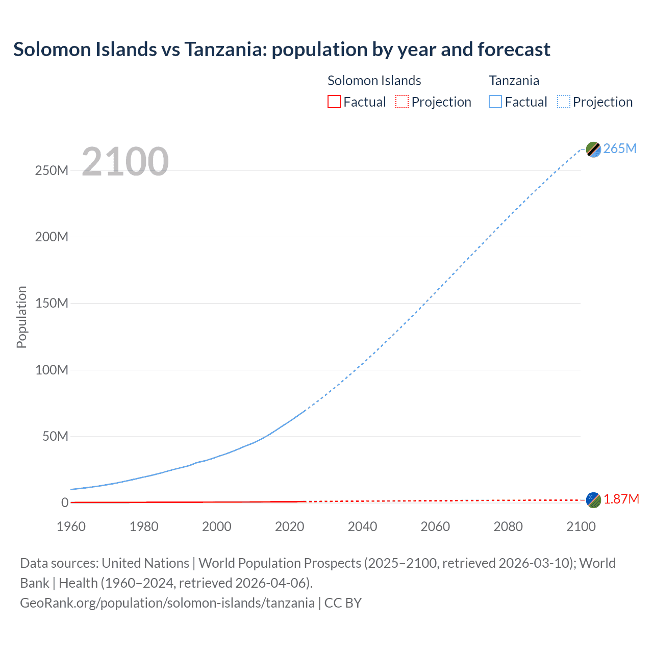 - Tanzania's population is 84.7 times bigger than the Solomon Islands'.