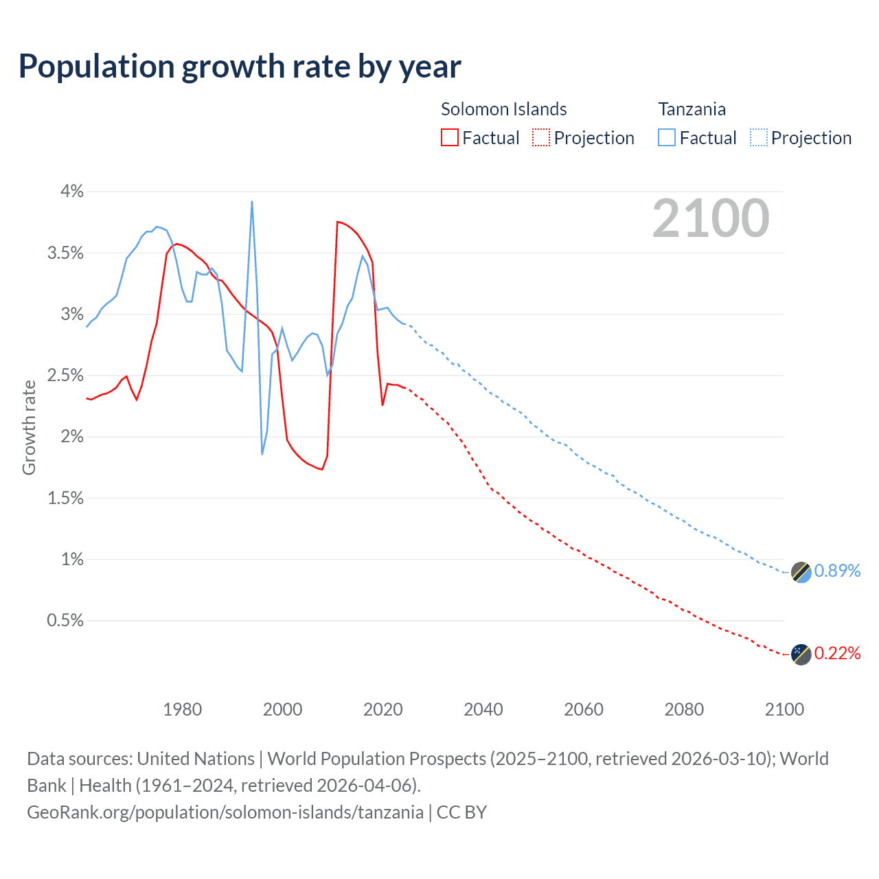 - For the last 10 years, the Solomon Islands has had an average growth rate of +2.95% per year vs +3.13% in Tanzania.
