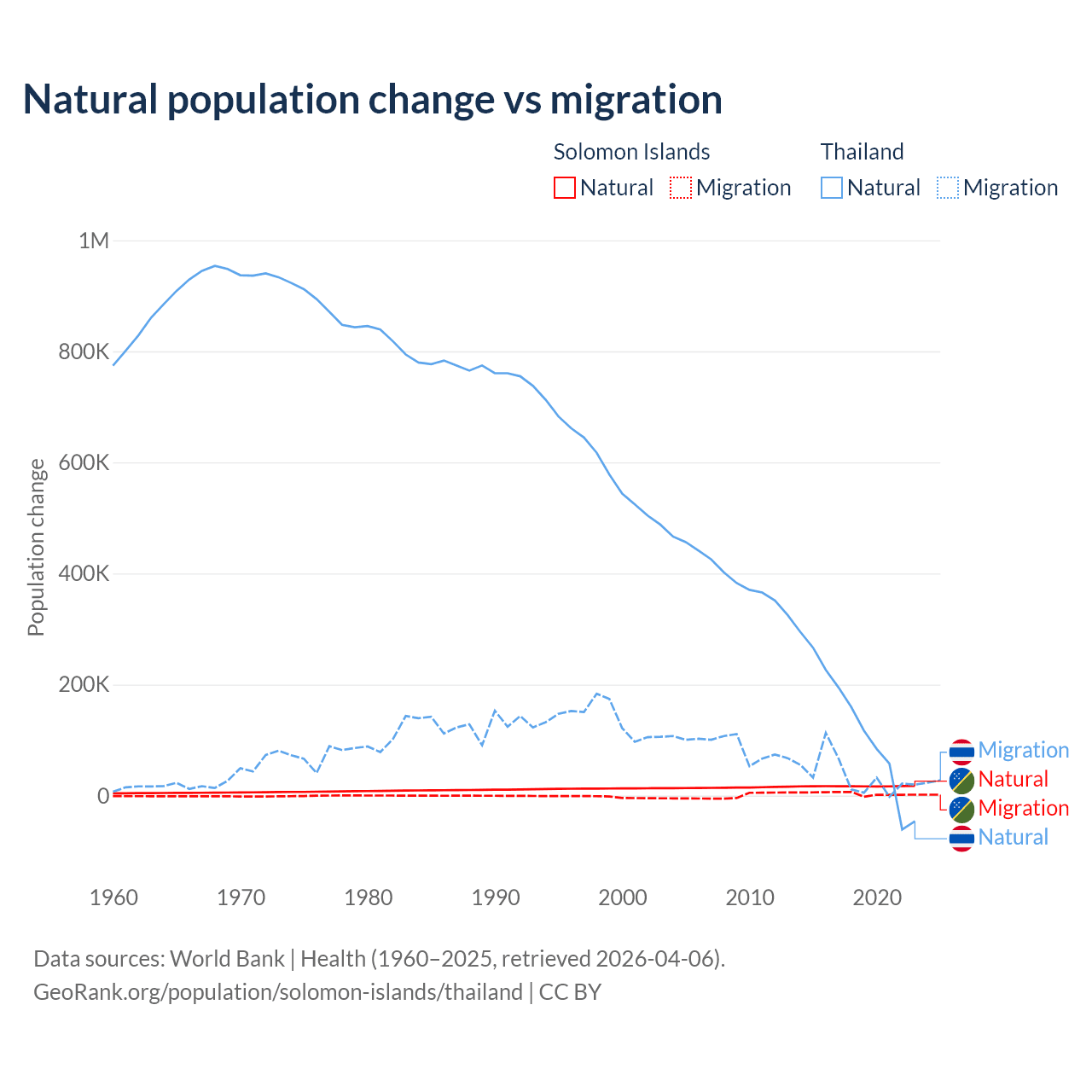 Over the last 10 years, 82.8% of the population change in the Solomon Islands is from natural causes (a gain of 168,727 people) and 17.2% is from migration (a gain of 35,031 people). In Thailand 78.4% is from natural causes (a gain of 1,292,528 people) and 21.6% is from migration (a gain of 355,361 people).