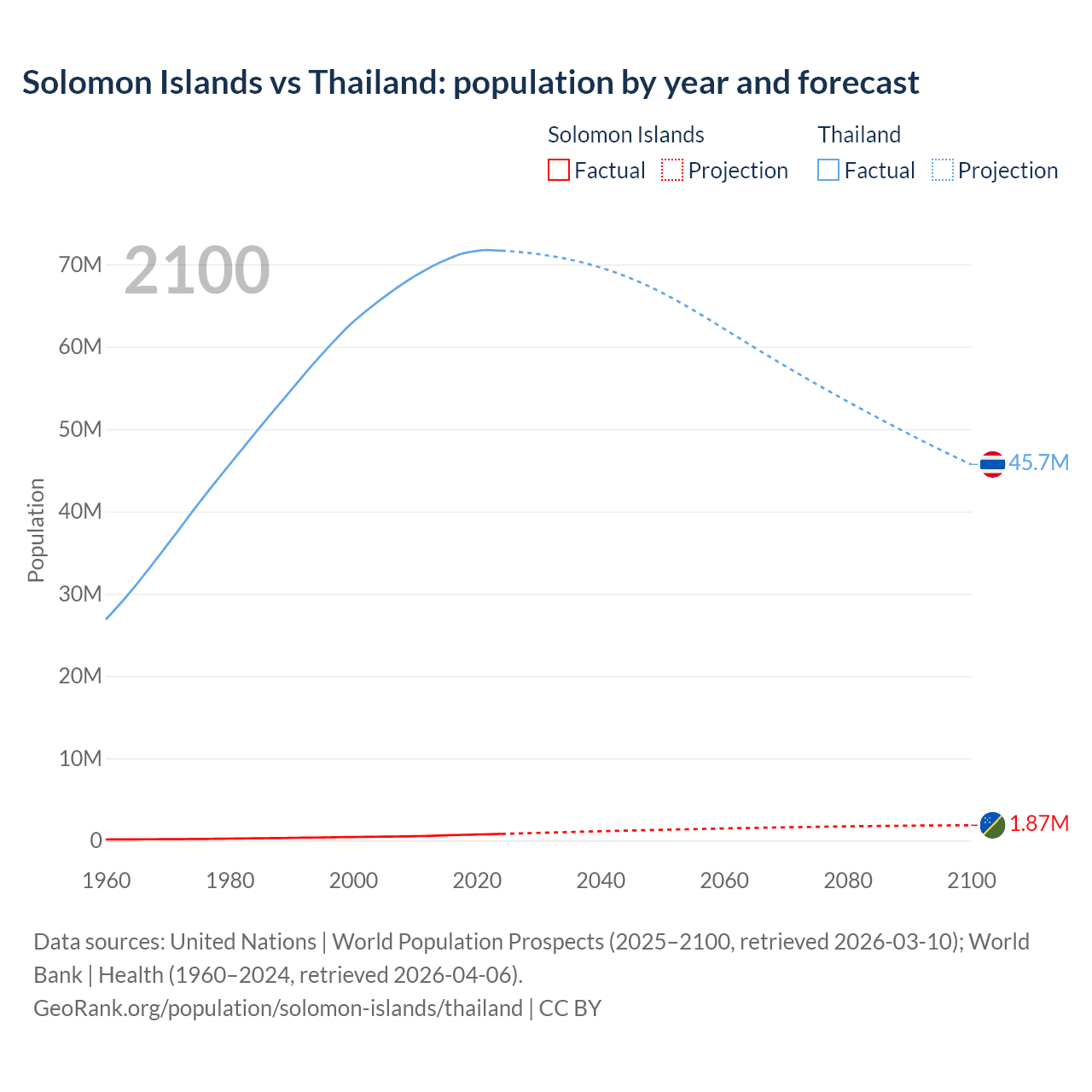 Solomon Islands vs Thailand: population by year and forecast