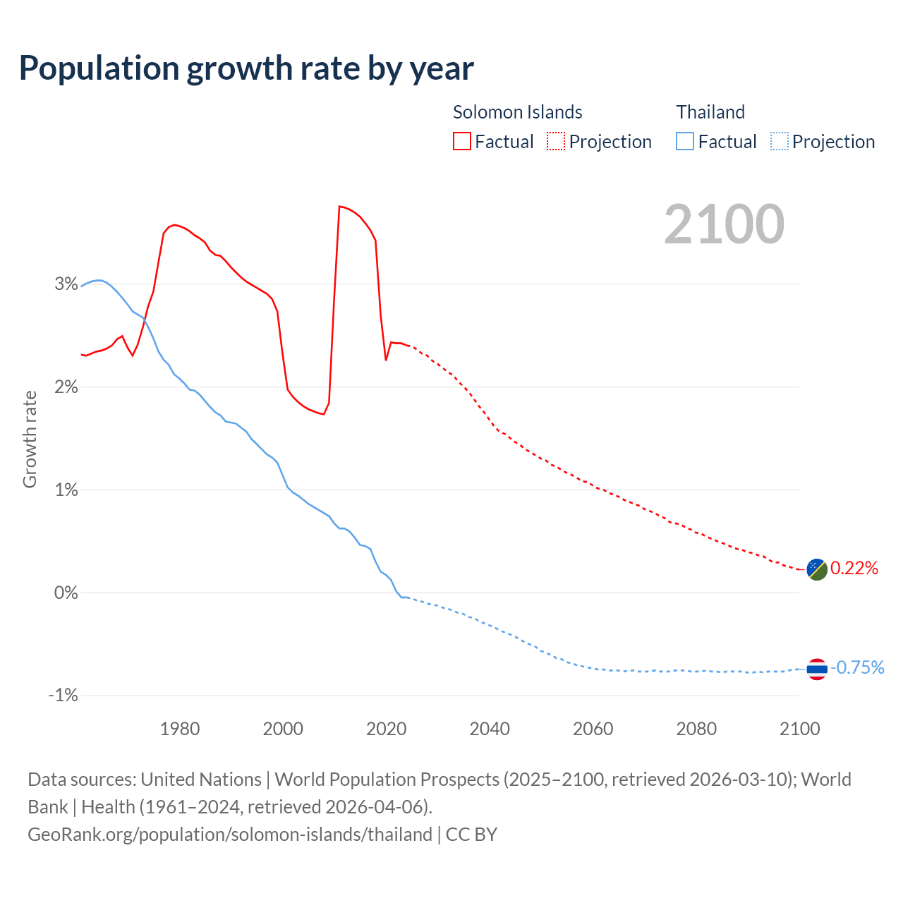 - For the last 10 years, the Solomon Islands has had an average growth rate of +2.95% per year vs +0.23% in Thailand.