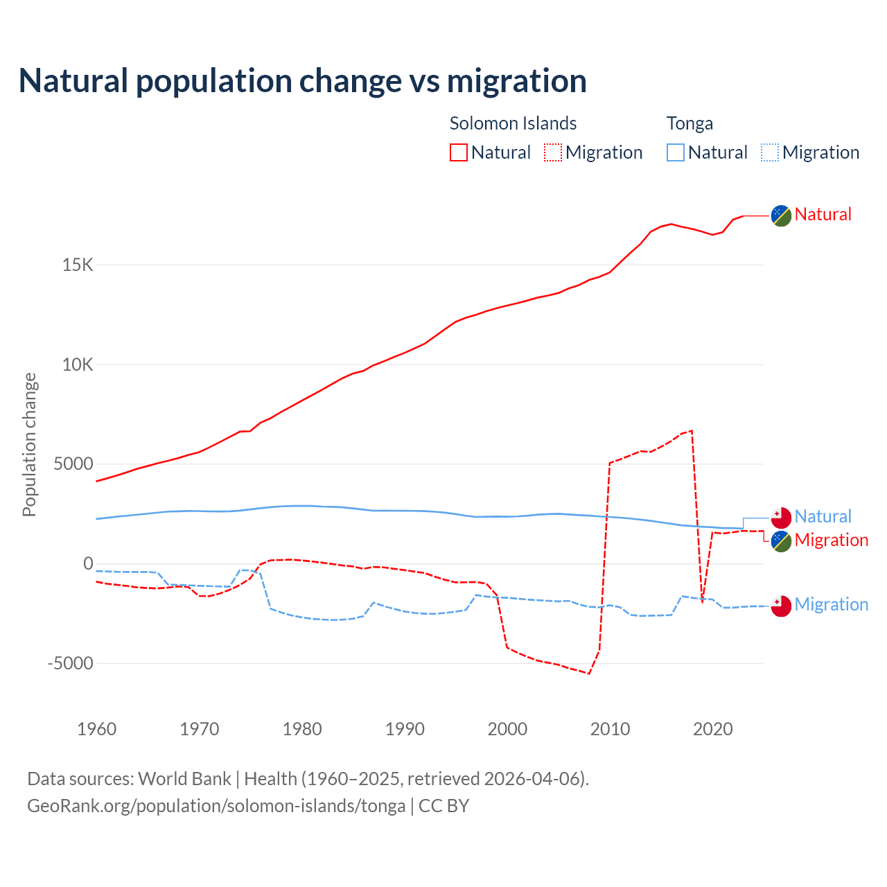 Over the last 10 years, 82.8% of the population change in the Solomon Islands is from natural causes (a gain of 168,727 people) and 17.2% is from migration (a gain of 35,031 people). In Tonga 46.9% is from natural causes (a gain of 18,919 people) and 53.1% is from migration (a loss of 21,384 people).