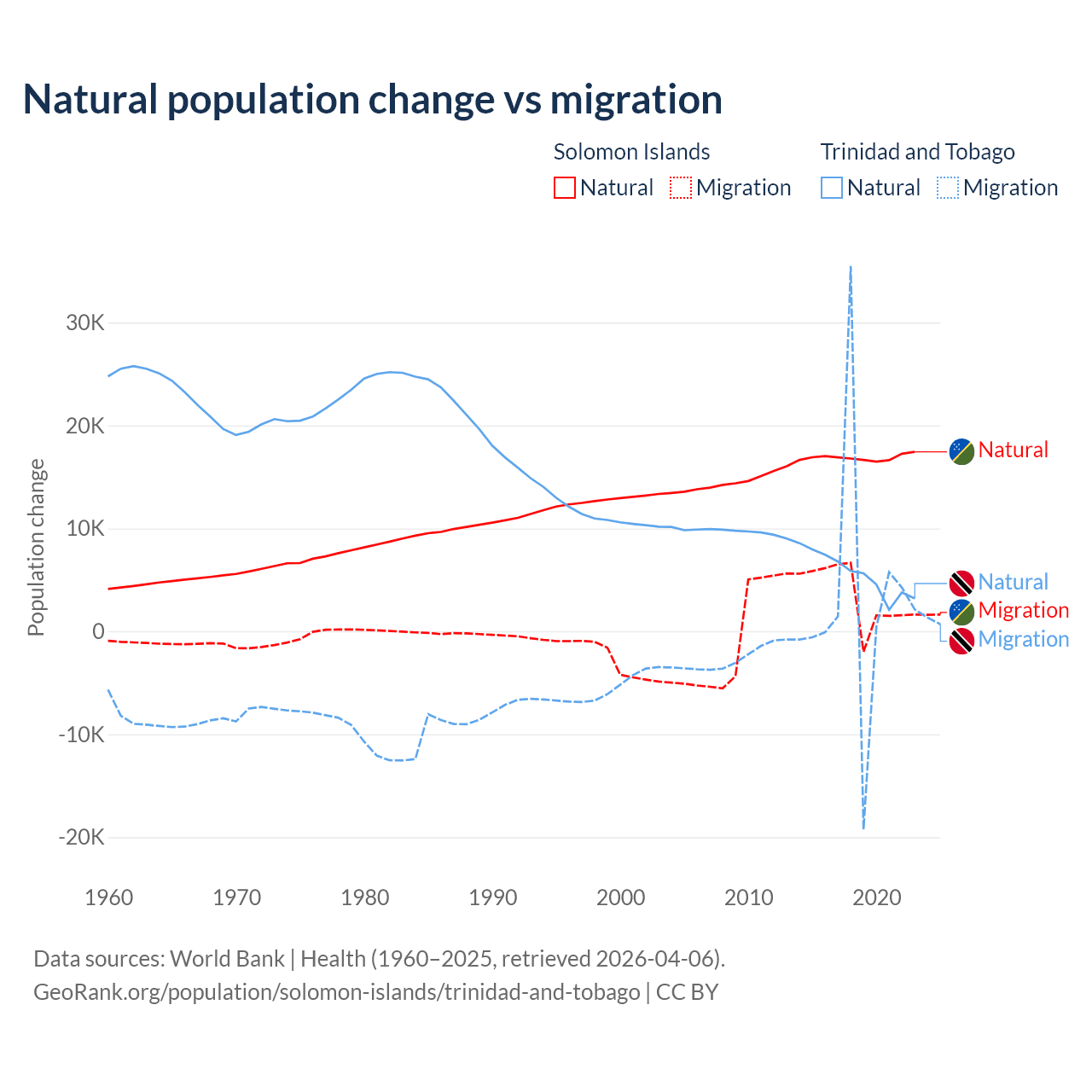 Over the last 10 years, 82.8% of the population change in the Solomon Islands is from natural causes (a gain of 168,727 people) and 17.2% is from migration (a gain of 35,031 people). In Trinidad and Tobago 66% is from natural causes (a gain of 55,887 people) and 34% is from migration (a gain of 28,785 people).