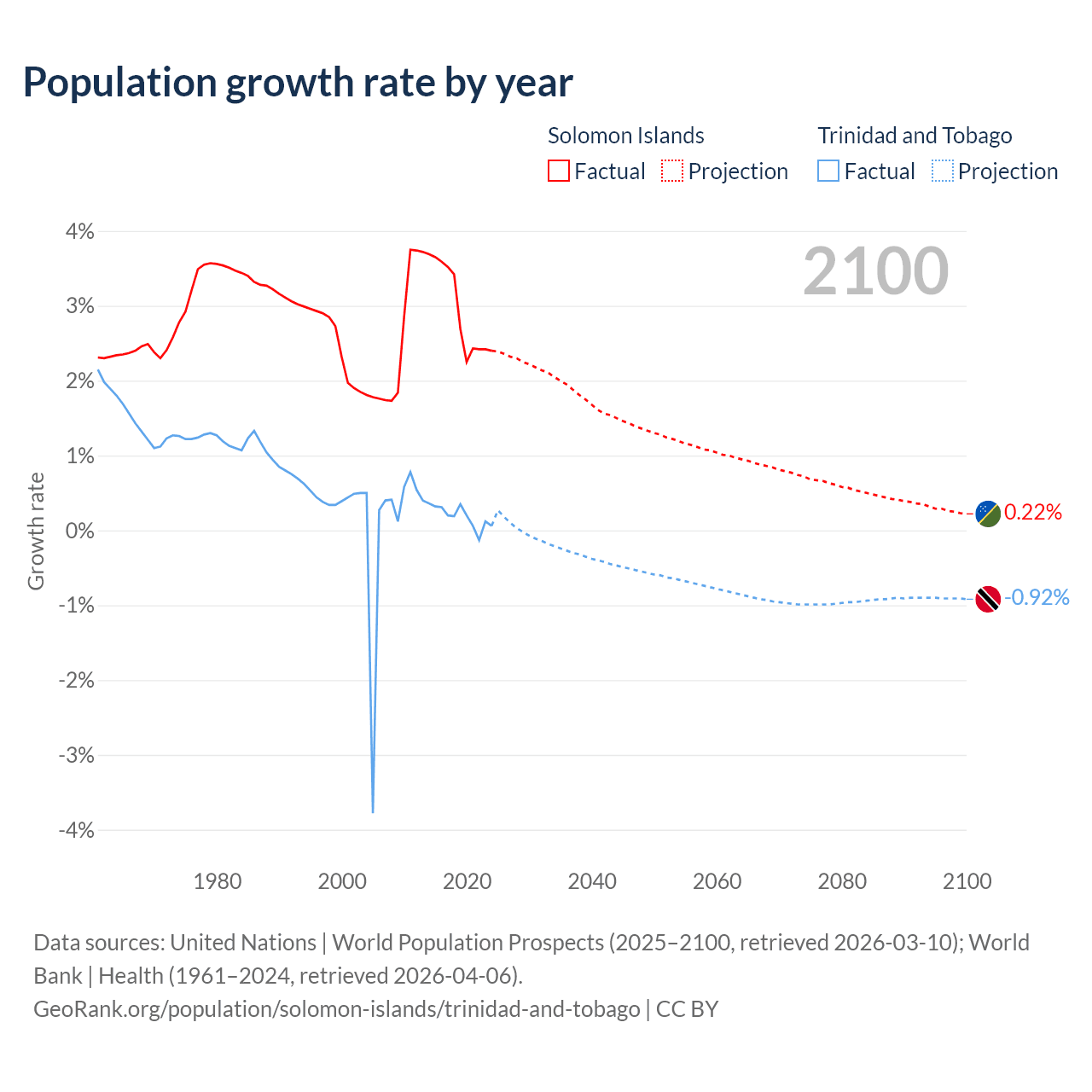 - For the last 10 years, the Solomon Islands has had an average growth rate of +2.95% per year vs +0.19% in Trinidad and Tobago.