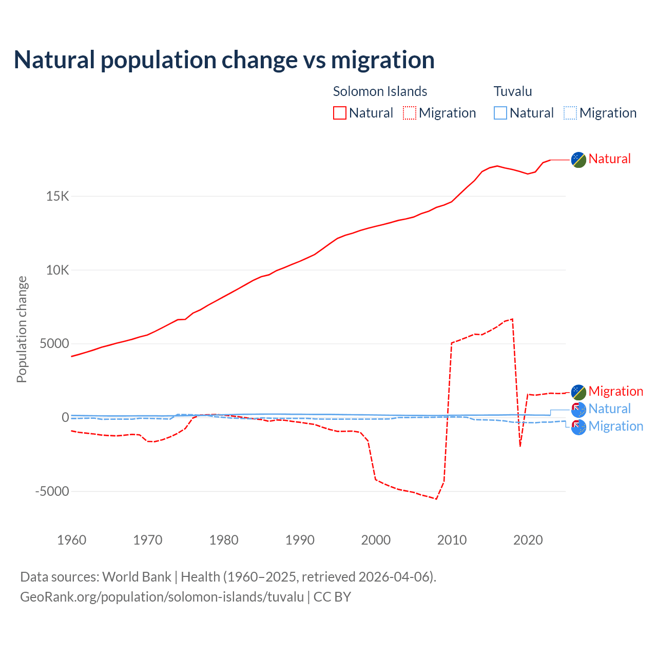 Over the last 10 years, 82.8% of the population change in the Solomon Islands is from natural causes (a gain of 168,727 people) and 17.2% is from migration (a gain of 35,031 people). In Tuvalu 35.5% is from natural causes (a gain of 1,556 people) and 64.5% is from migration (a loss of 2,827 people).