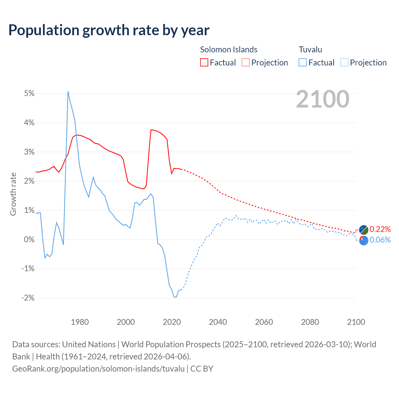 - For the last 10 years, the Solomon Islands has had an average growth rate of +2.95% per year vs -1.19% in Tuvalu.