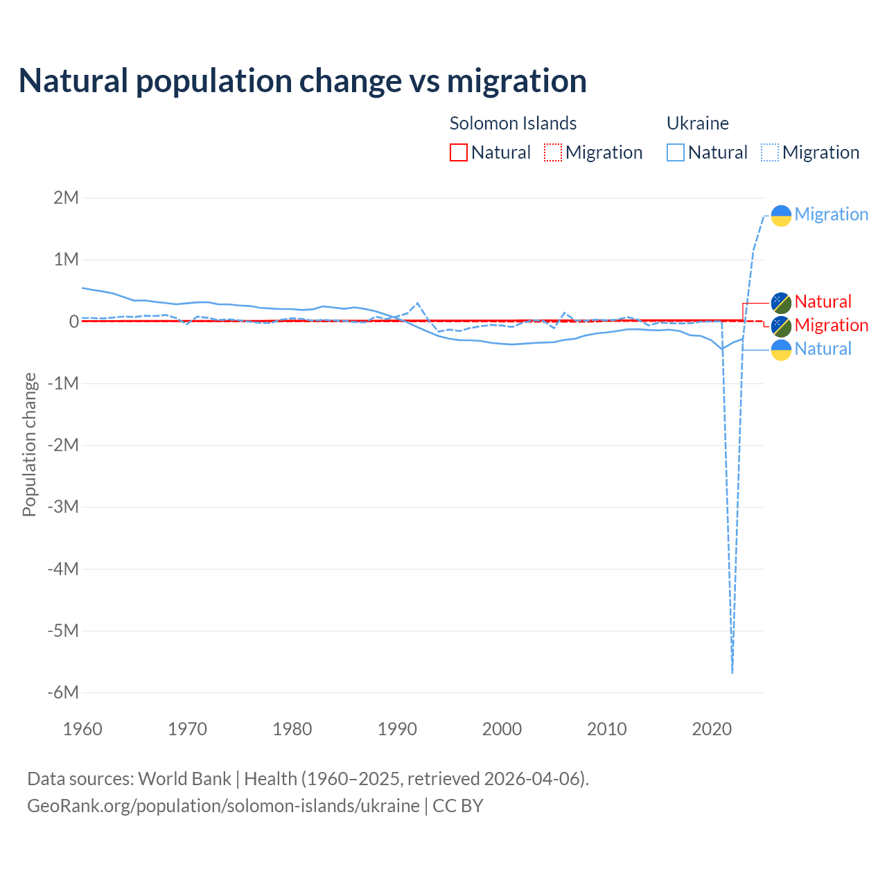 Over the last 10 years, 82.8% of the population change in the Solomon Islands is from natural causes (a gain of 168,727 people) and 17.2% is from migration (a gain of 35,031 people). In Ukraine 28.2% is from natural causes (a loss of 2,435,153 people) and 71.8% is from migration (a loss of 6,198,995 people).