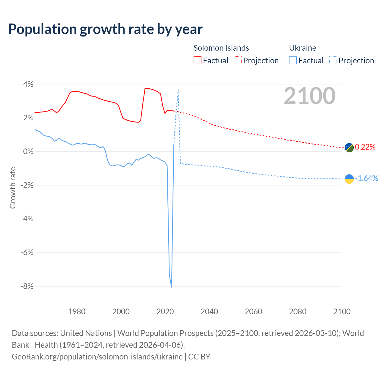 - For the last 10 years, the Solomon Islands has had an average growth rate of +2.95% per year vs -1.74% in Ukraine.