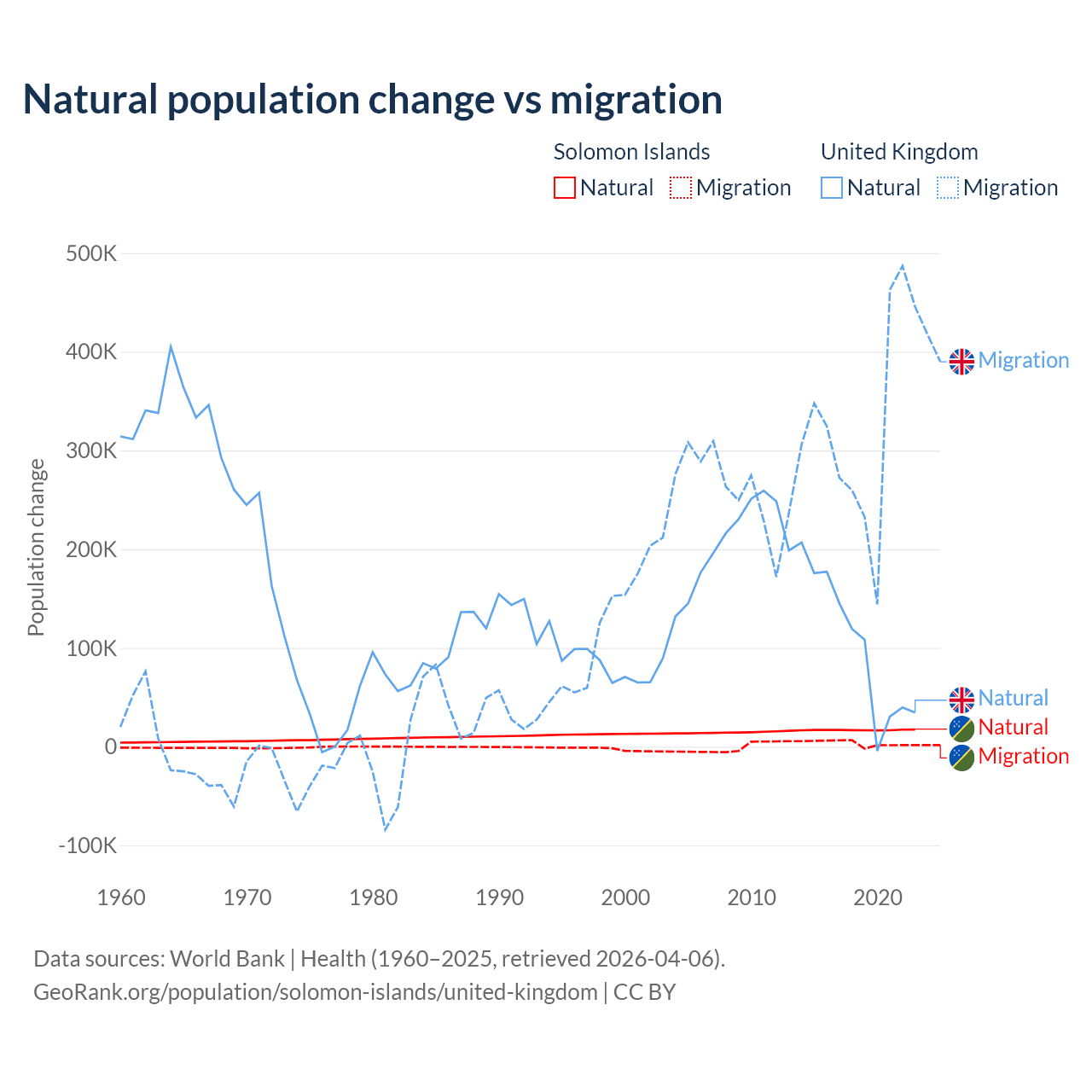 Over the last 10 years, 82.8% of the population change in the Solomon Islands is from natural causes (a gain of 168,727 people) and 17.2% is from migration (a gain of 35,031 people). In the United Kingdom 23.9% is from natural causes (a gain of 1,033,129 people) and 76.1% is from migration (a gain of 3,283,101 people).