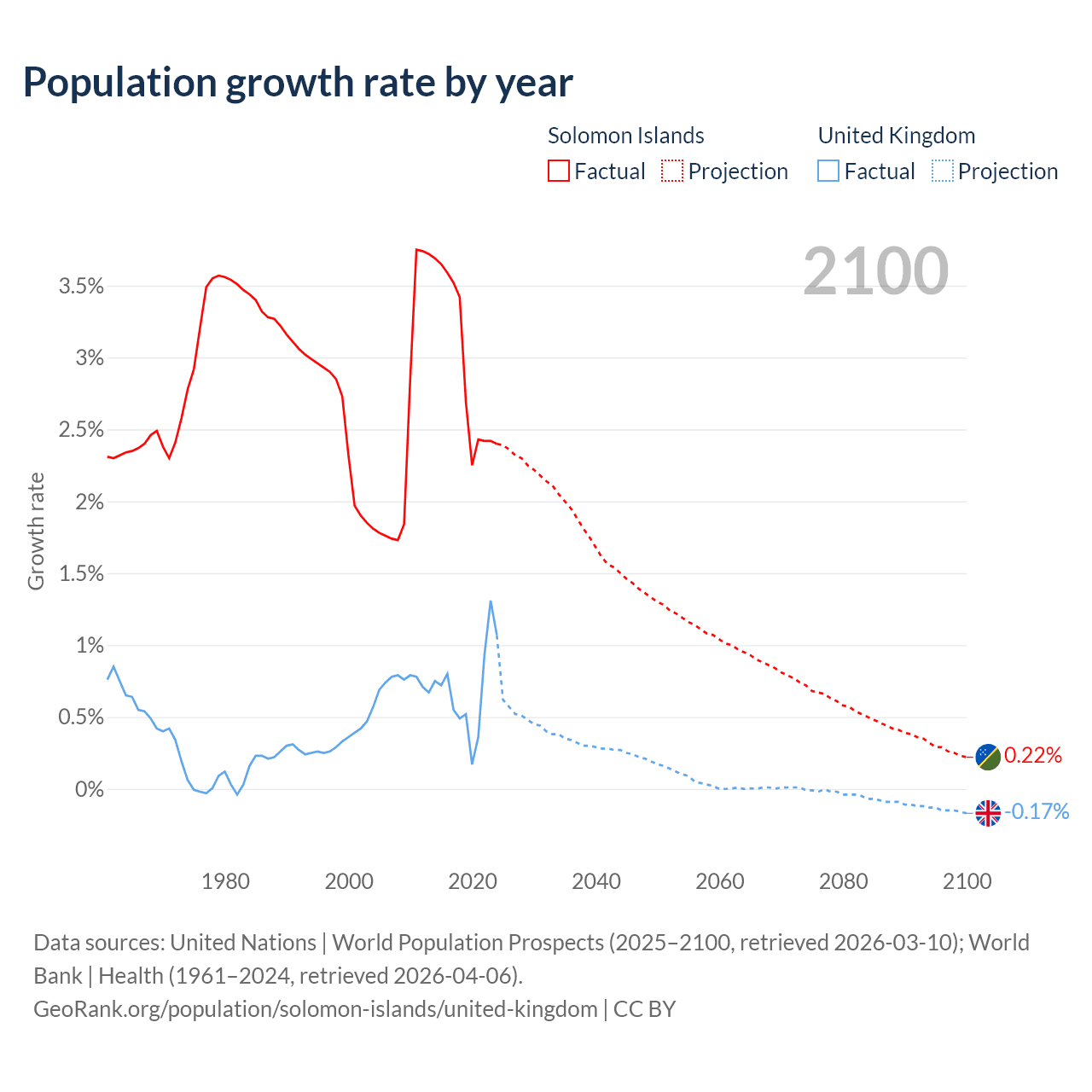 - For the last 10 years, the Solomon Islands has had an average growth rate of +2.95% per year vs +0.7% in the United Kingdom.