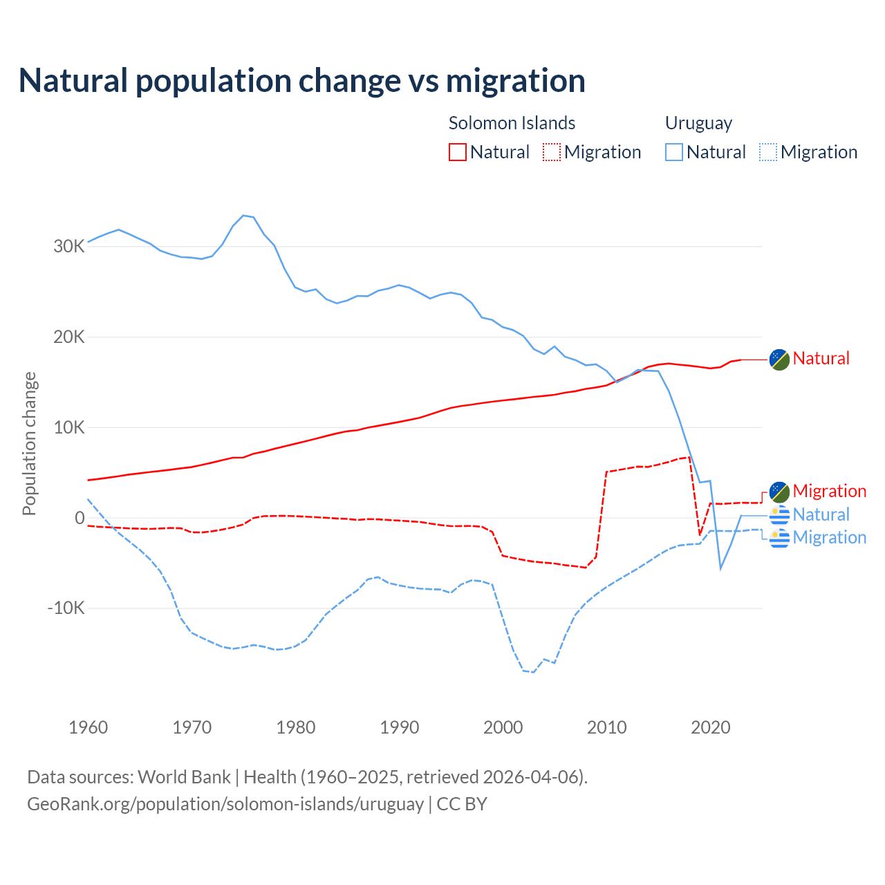 Over the last 10 years, 82.8% of the population change in the Solomon Islands is from natural causes (a gain of 168,727 people) and 17.2% is from migration (a gain of 35,031 people). In Uruguay 70% is from natural causes (a gain of 64,303 people) and 30% is from migration (a loss of 27,501 people).
