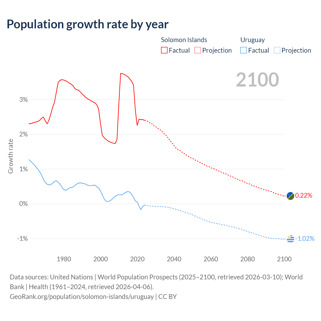 - For the last 10 years, the Solomon Islands has had an average growth rate of +2.95% per year vs +0.11% in Uruguay.
