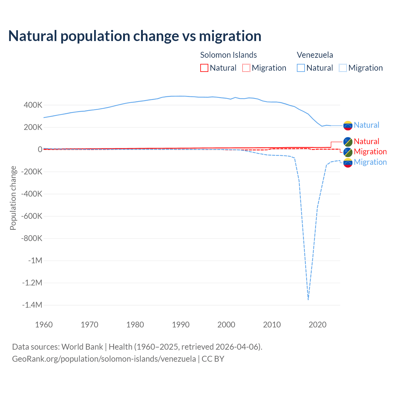 Over the last 10 years, 82.8% of the population change in the Solomon Islands is from natural causes (a gain of 168,727 people) and 17.2% is from migration (a gain of 35,031 people). In Venezuela 38.6% is from natural causes (a gain of 2,946,257 people) and 61.4% is from migration (a loss of 4,683,227 people).