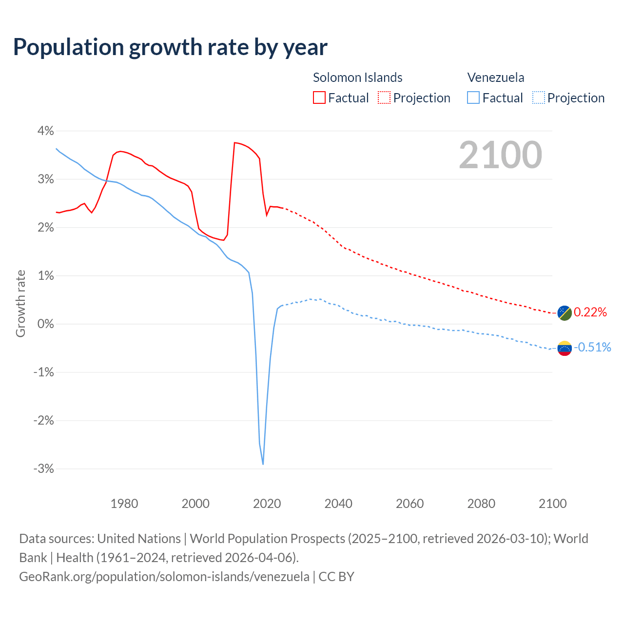 - For the last 10 years, the Solomon Islands has had an average growth rate of +2.95% per year vs -0.46% in Venezuela.