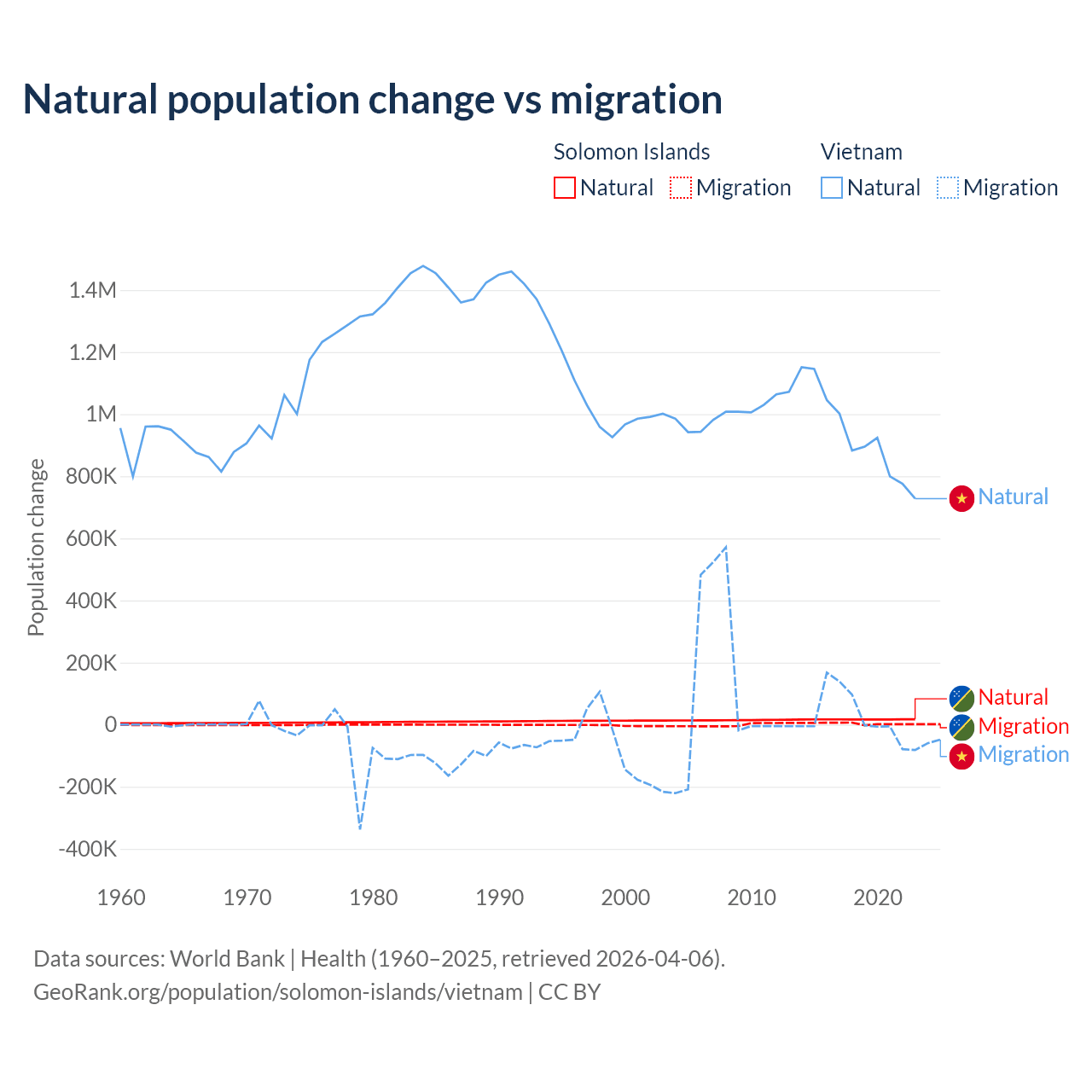 Over the last 10 years, 82.8% of the population change in the Solomon Islands is from natural causes (a gain of 168,727 people) and 17.2% is from migration (a gain of 35,031 people). In Vietnam 97.7% is from natural causes (a gain of 9,349,756 people) and 2.29% is from migration (a gain of 219,073 people).