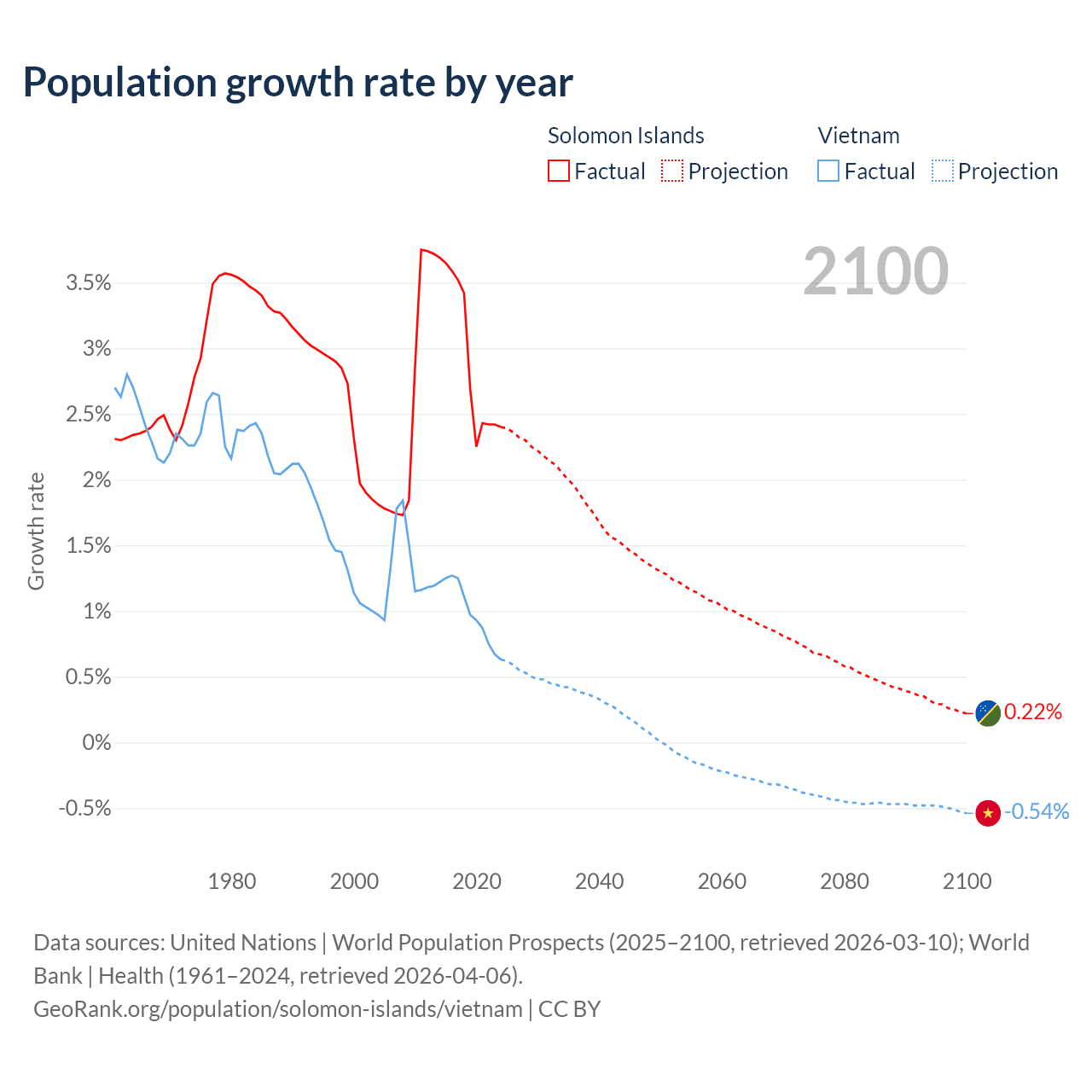 - For the last 10 years, the Solomon Islands has had an average growth rate of +2.95% per year vs +0.99% in Vietnam.