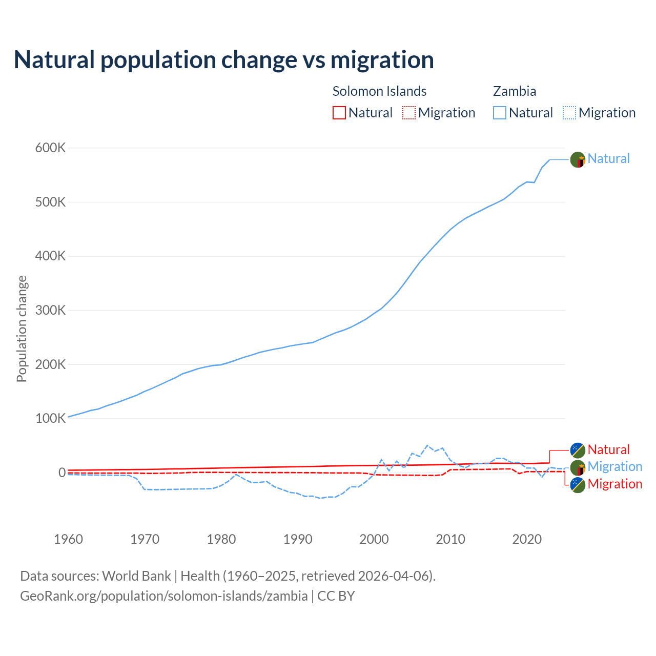 Over the last 10 years, 82.8% of the population change in the Solomon Islands is from natural causes (a gain of 168,727 people) and 17.2% is from migration (a gain of 35,031 people). In Zambia 97.4% is from natural causes (a gain of 5,233,797 people) and 2.58% is from migration (a gain of 138,554 people).
