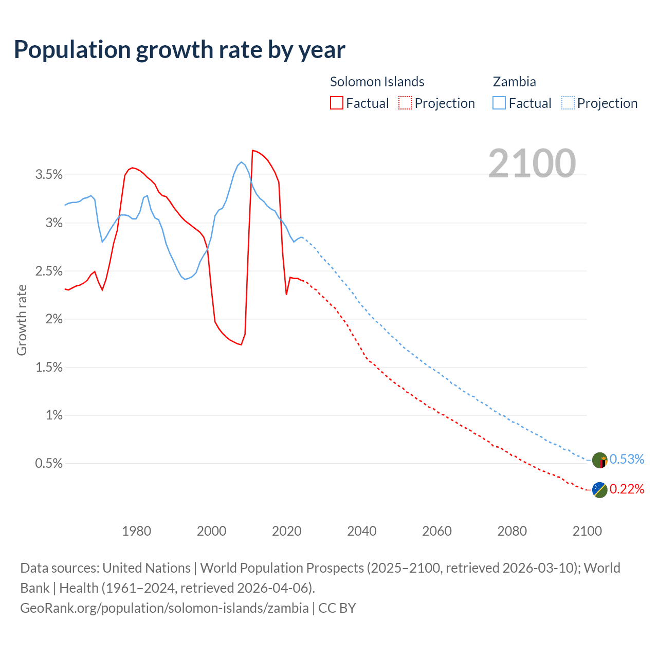 - For the last 10 years, the Solomon Islands has had an average growth rate of +2.95% per year vs +3% in Zambia.