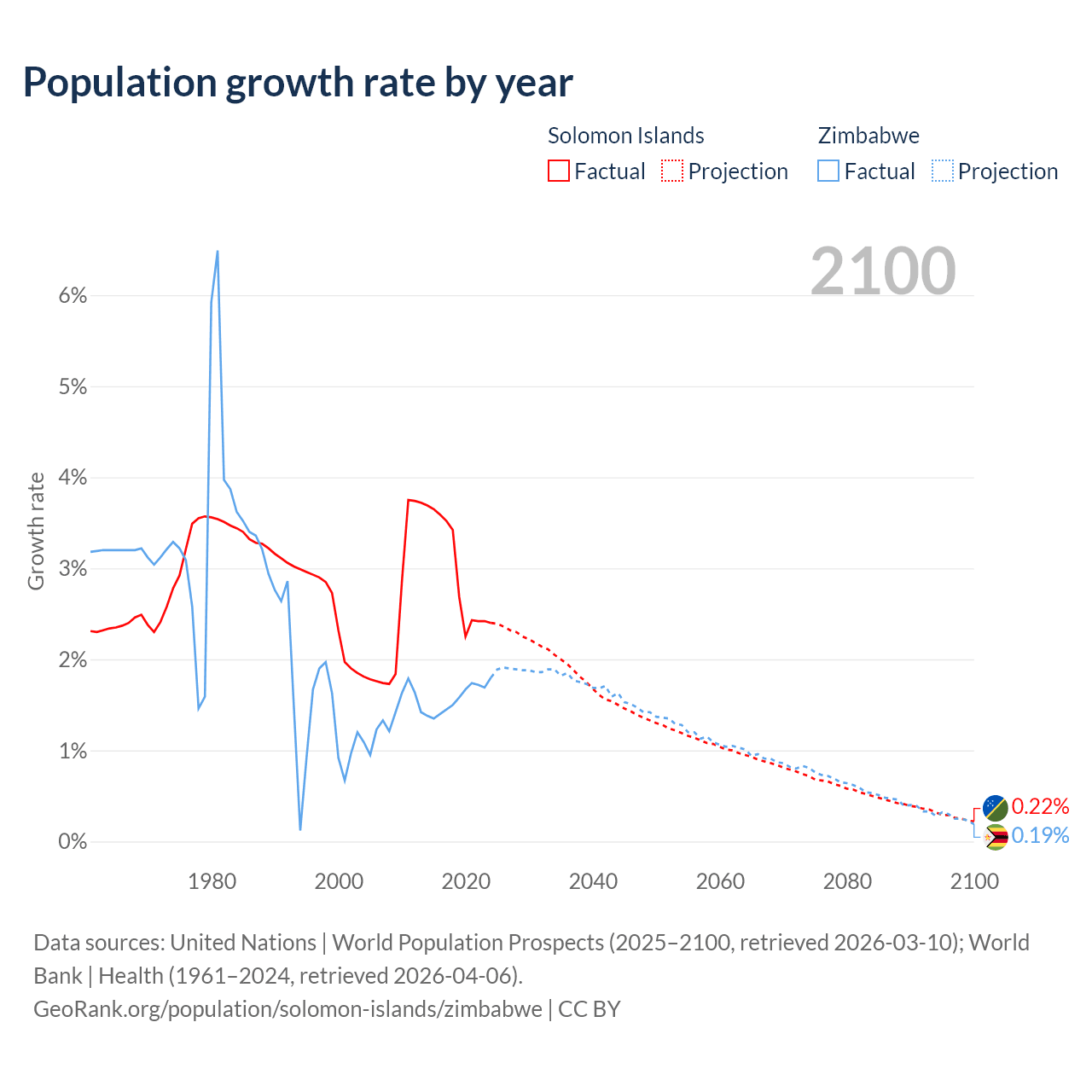 - For the last 10 years, the Solomon Islands has had an average growth rate of +2.95% per year vs +1.57% in Zimbabwe.
