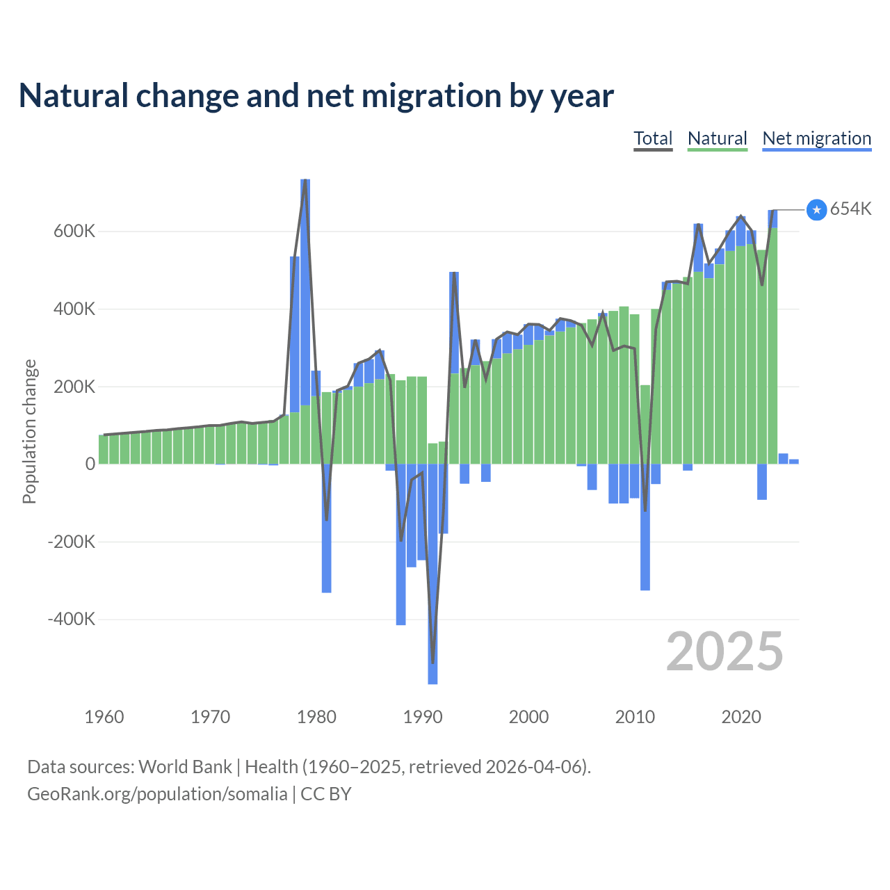 Over the last 10 years, 94.4% of the population change in Somalia is from natural causes (a gain of 5,270,105 people) and 5.58% is from migration (a gain of 311,487 people).