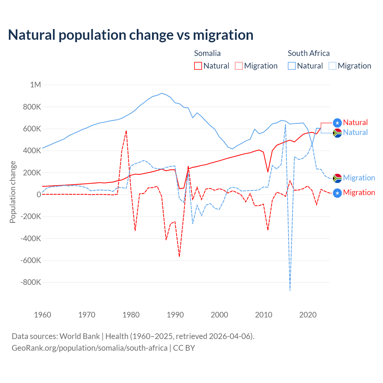 Over the last 10 years, 94.4% of the population change in Somalia is from natural causes (a gain of 5,270,105 people) and 5.58% is from migration (a gain of 311,487 people). In South Africa 72.8% is from natural causes (a gain of 6,190,027 people) and 27.2% is from migration (a gain of 2,316,795 people).