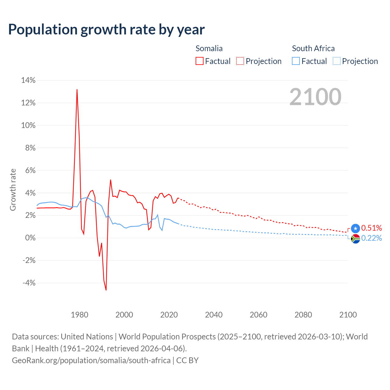 - For the last 10 years, Somalia has had an average growth rate of +3.61% per year vs +1.44% in South Africa.