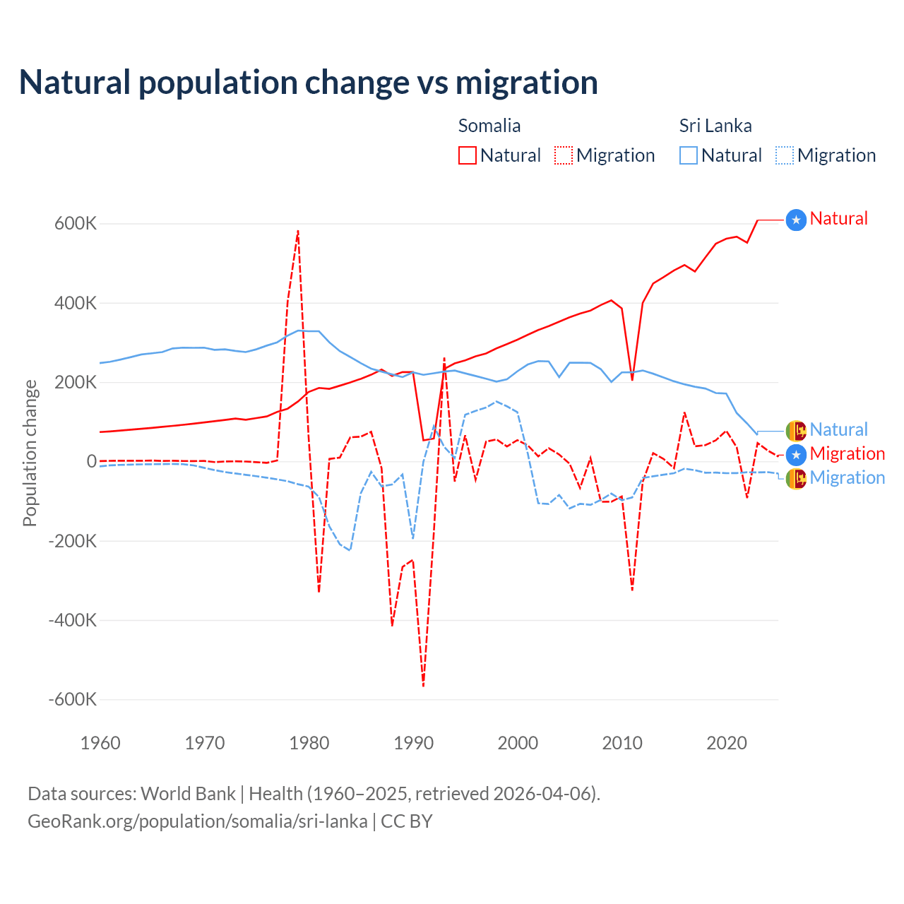 Over the last 10 years, 94.4% of the population change in Somalia is from natural causes (a gain of 5,270,105 people) and 5.58% is from migration (a gain of 311,487 people). In Sri Lanka 85.3% is from natural causes (a gain of 1,605,749 people) and 14.7% is from migration (a loss of 276,121 people).