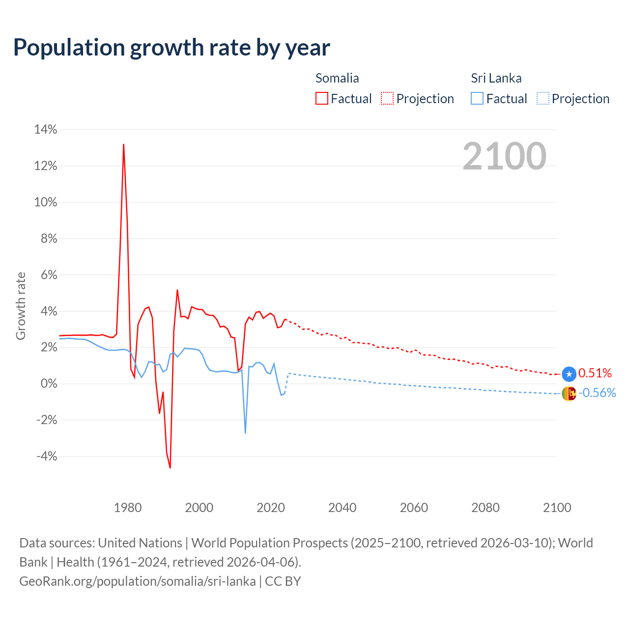 - For the last 10 years, Somalia has had an average growth rate of +3.61% per year vs +0.57% in Sri Lanka.
