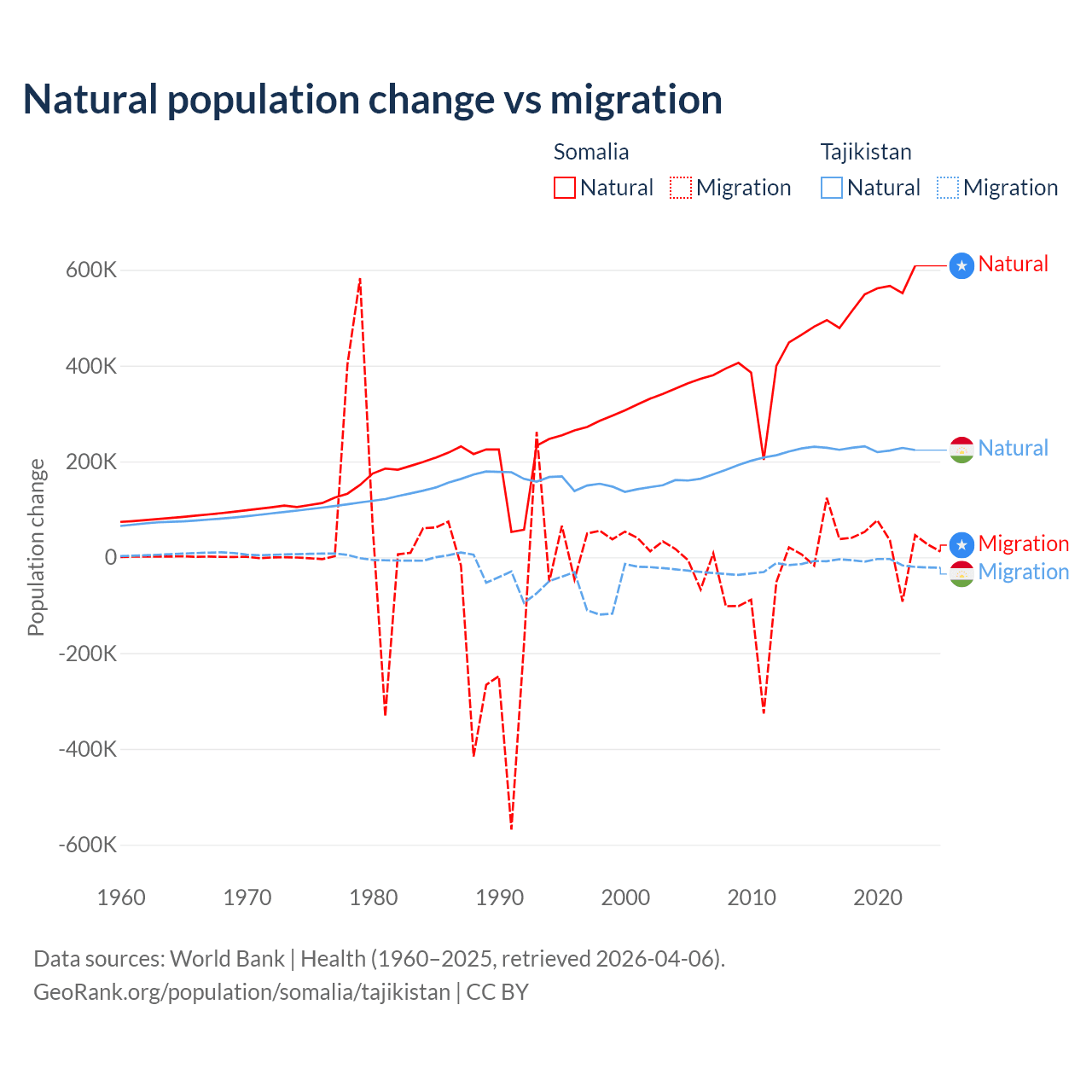 Over the last 10 years, 94.4% of the population change in Somalia is from natural causes (a gain of 5,270,105 people) and 5.58% is from migration (a gain of 311,487 people). In Tajikistan 96% is from natural causes (a gain of 2,266,045 people) and 3.95% is from migration (a loss of 93,205 people).