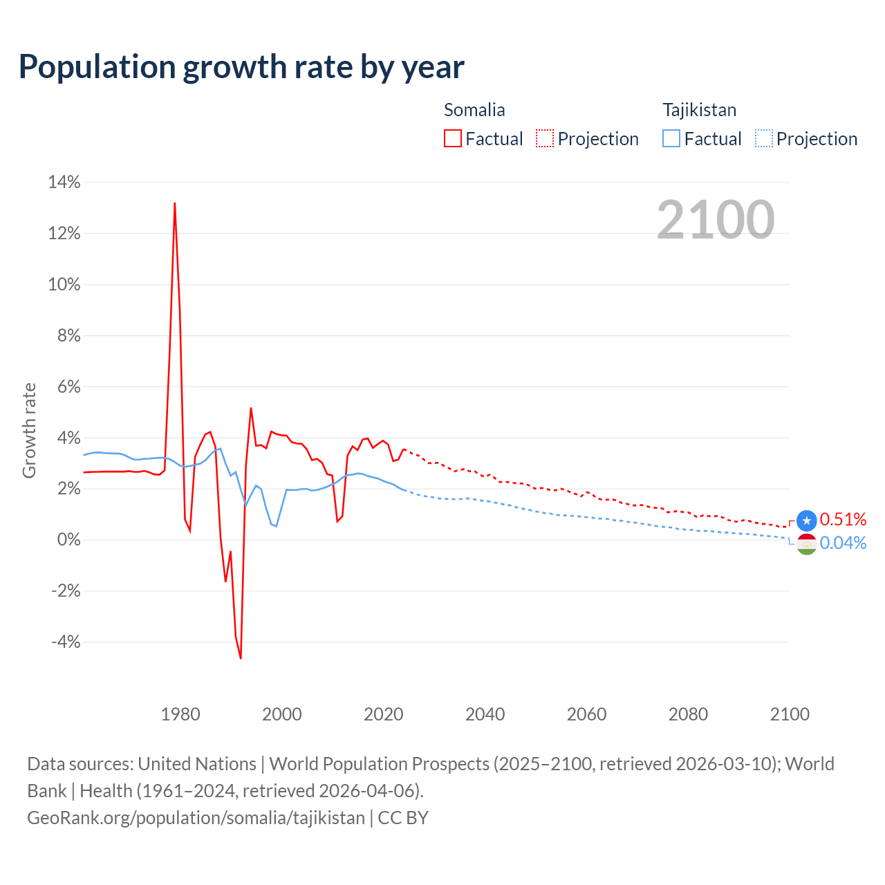 - For the last 10 years, Somalia has had an average growth rate of +3.61% per year vs +2.33% in Tajikistan.