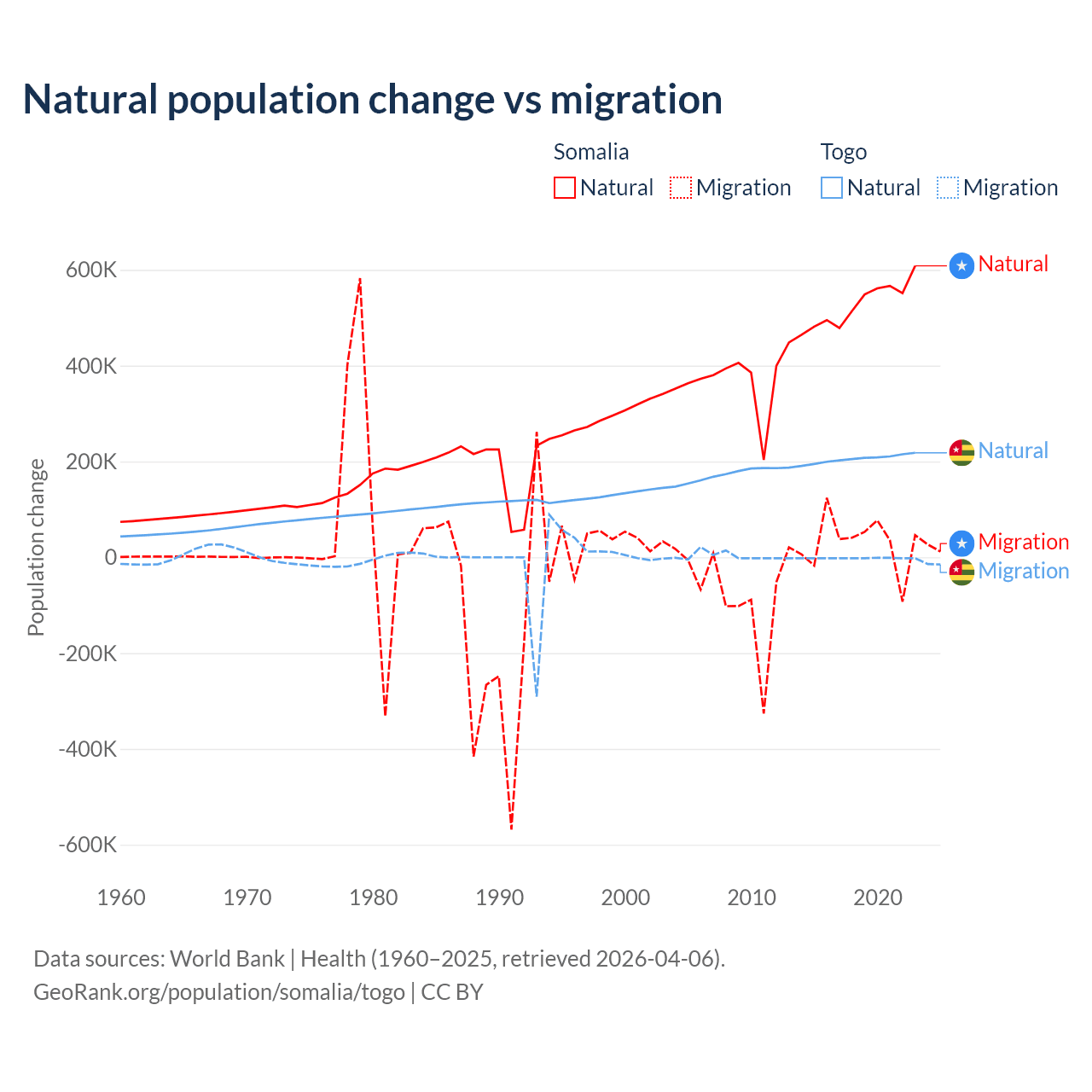 Over the last 10 years, 94.4% of the population change in Somalia is from natural causes (a gain of 5,270,105 people) and 5.58% is from migration (a gain of 311,487 people). In Togo 99.1% is from natural causes (a gain of 2,052,115 people) and 0.86% is from migration (a loss of 17,852 people).