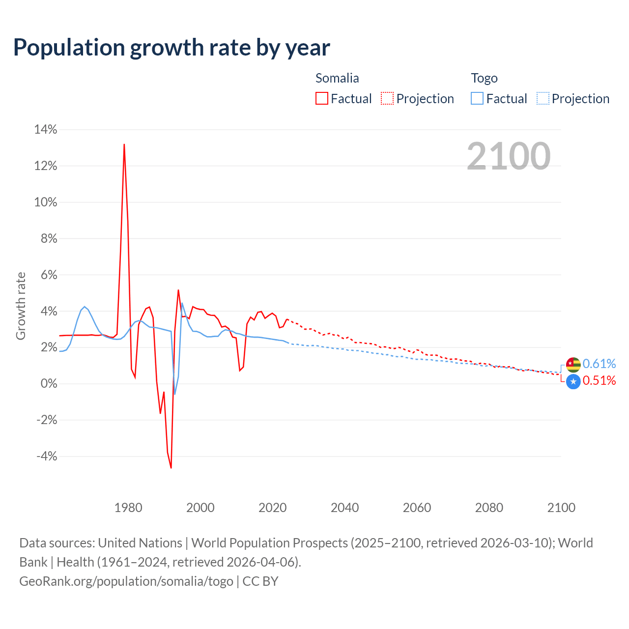 - For the last 10 years, Somalia has had an average growth rate of +3.61% per year vs +2.46% in Togo.