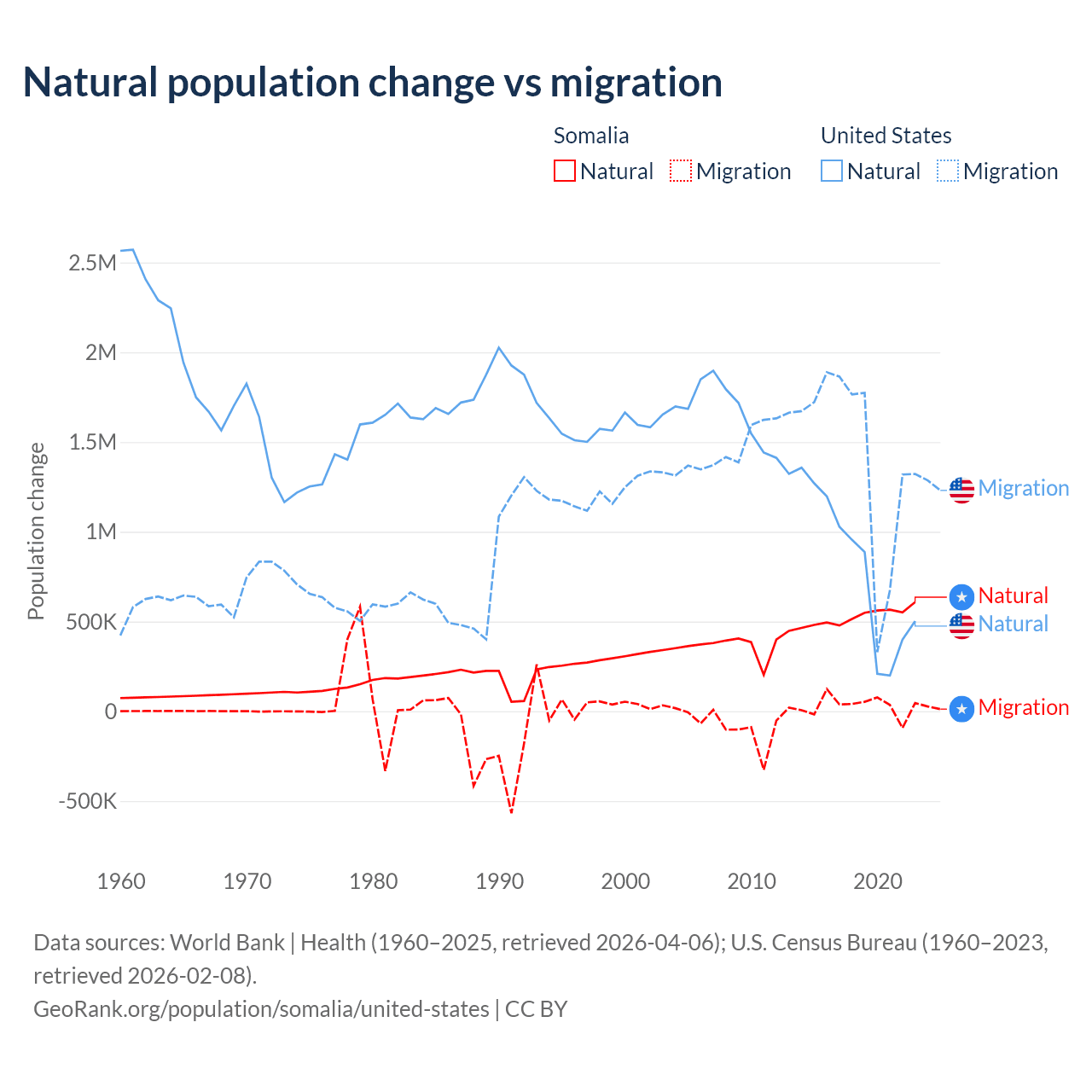 Over the last 10 years, 94.4% of the population change in Somalia is from natural causes (a gain of 5,270,105 people) and 5.58% is from migration (a gain of 311,487 people). In the United States 35.8% is from natural causes (a gain of 8,005,866 people) and 64.2% is from migration (a gain of 14,334,286 people).