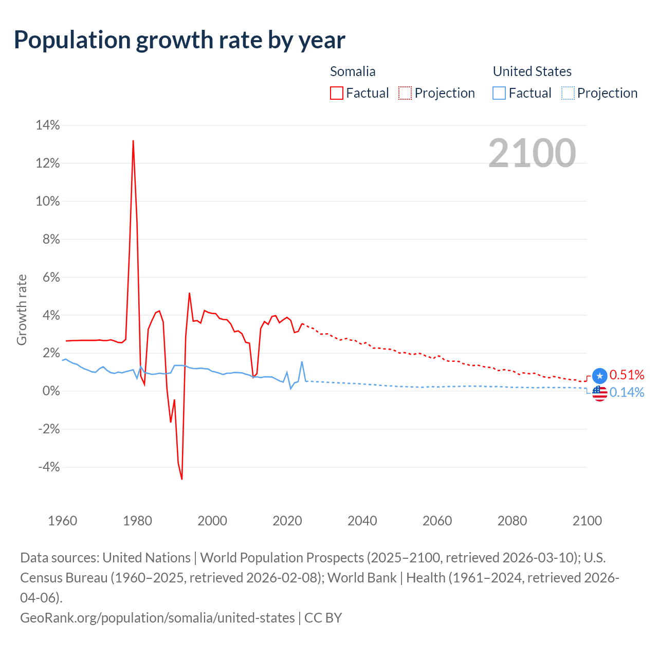 - For the last 10 years, Somalia has had an average growth rate of +3.61% per year vs +0.65% in the United States.