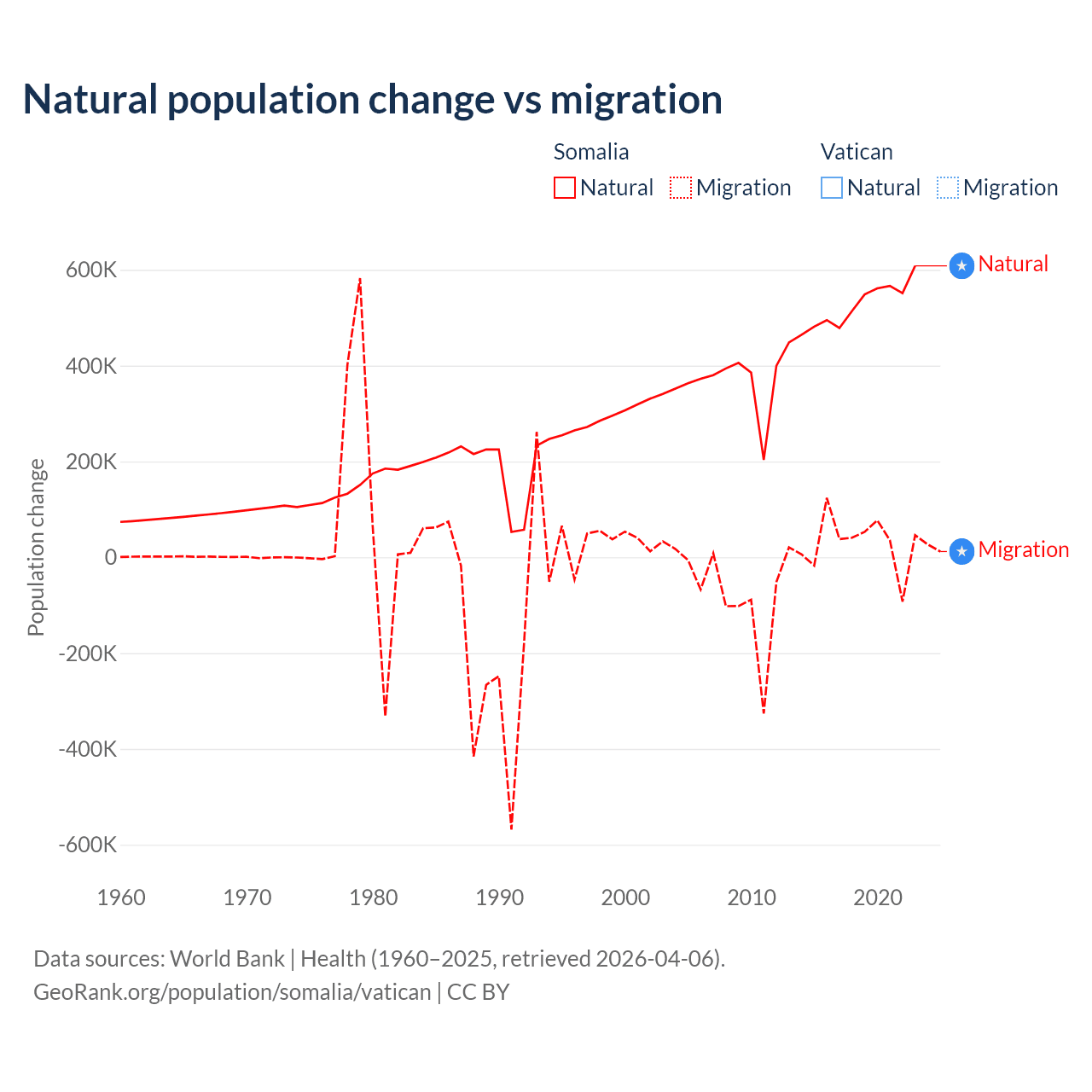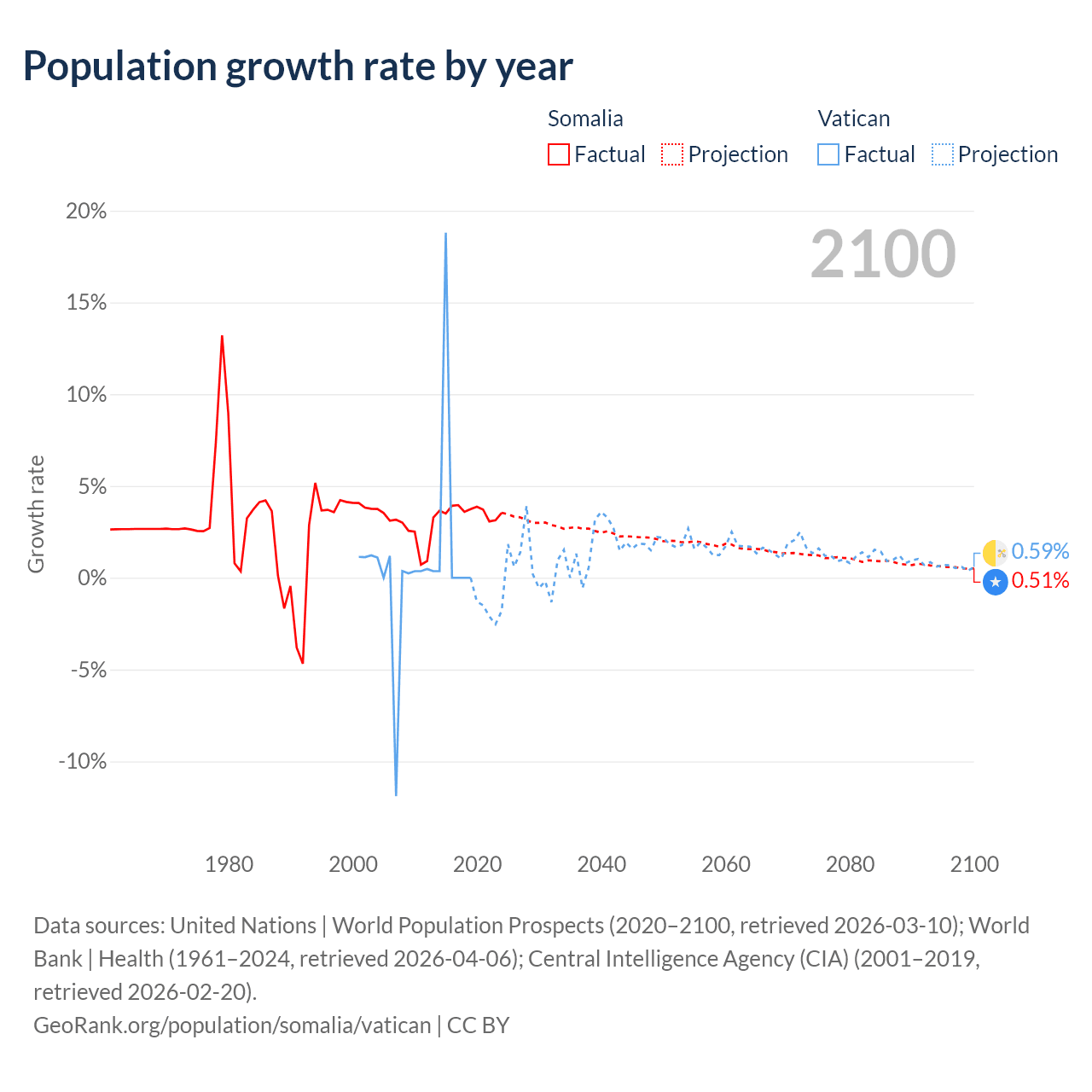 - For the last 10 years, Somalia has had an average growth rate of +3.61% per year vs +1.9% in the Vatican.