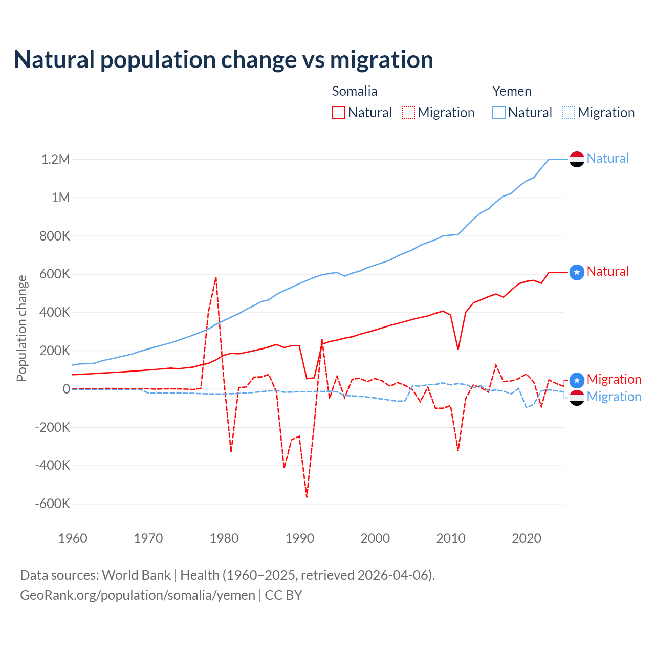 Over the last 10 years, 94.4% of the population change in Somalia is from natural causes (a gain of 5,270,105 people) and 5.58% is from migration (a gain of 311,487 people). In Yemen 97.8% is from natural causes (a gain of 10,460,813 people) and 2.17% is from migration (a loss of 231,814 people).