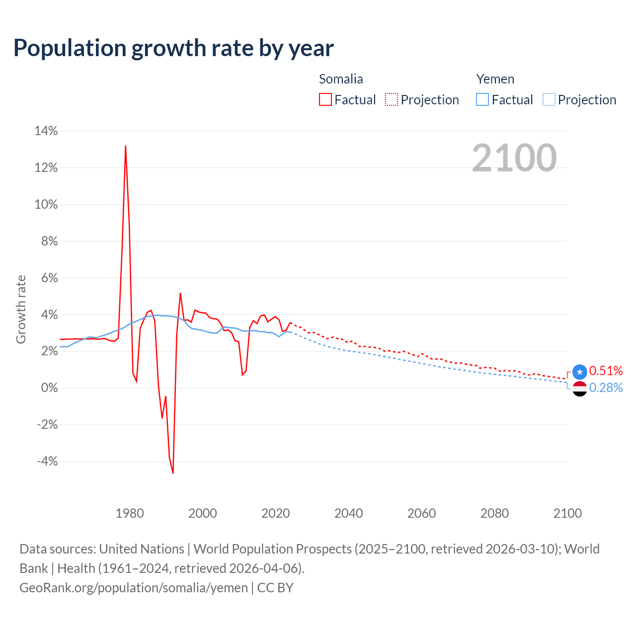 - For the last 10 years, Somalia has had an average growth rate of +3.61% per year vs +3% in Yemen.