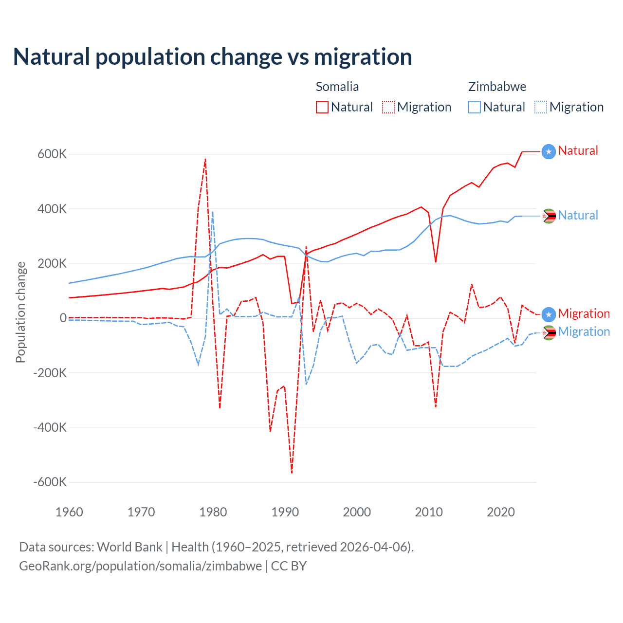 Over the last 10 years, 94.4% of the population change in Somalia is from natural causes (a gain of 5,270,105 people) and 5.58% is from migration (a gain of 311,487 people). In Zimbabwe 74.9% is from natural causes (a gain of 3,558,487 people) and 25.1% is from migration (a loss of 1,192,807 people).