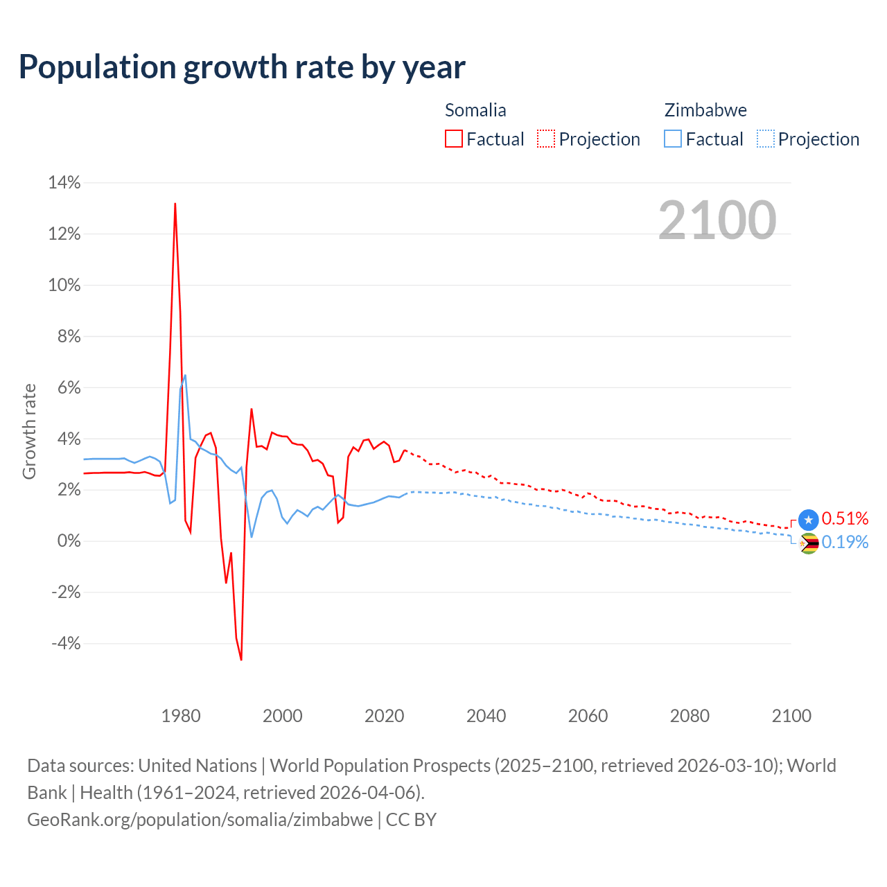 - For the last 10 years, Somalia has had an average growth rate of +3.61% per year vs +1.57% in Zimbabwe.