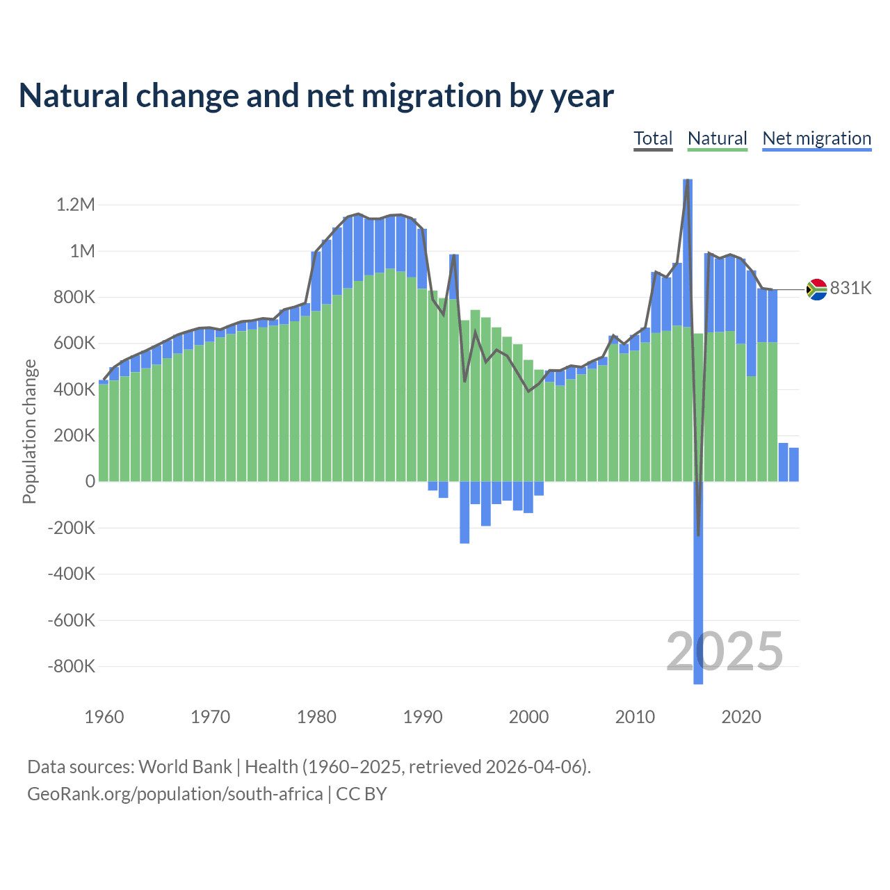 Over the last 10 years, 72.8% of the population change in South Africa is from natural causes (a gain of 6,190,027 people) and 27.2% is from migration (a gain of 2,316,795 people).