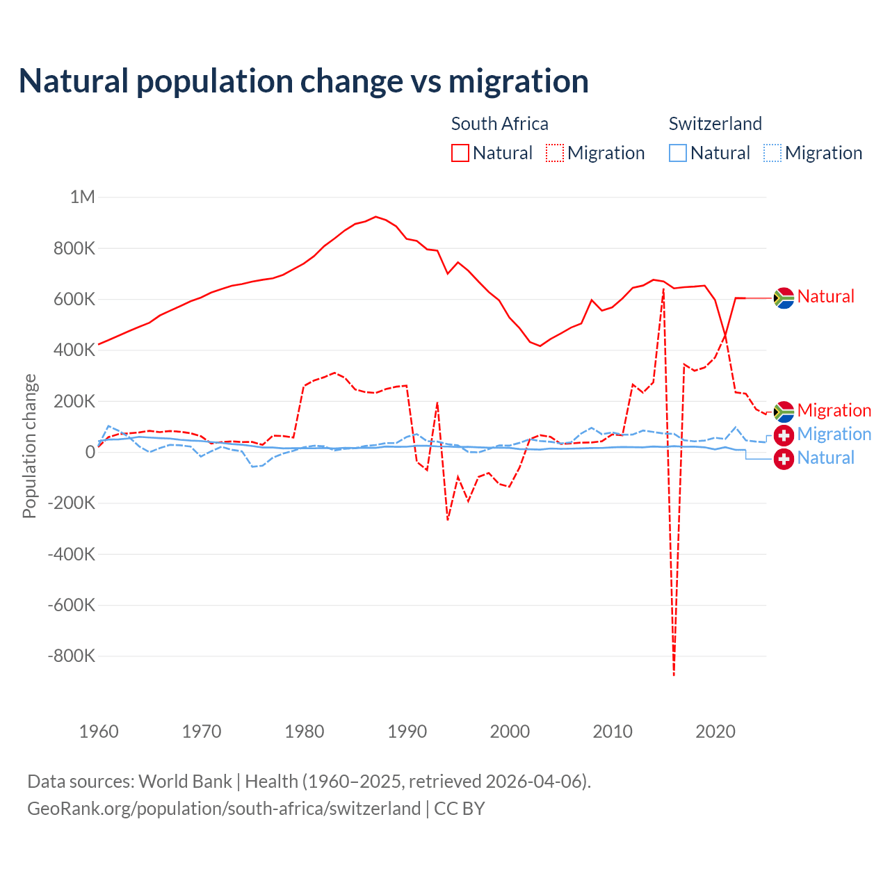 Over the last 10 years, 72.8% of the population change in South Africa is from natural causes (a gain of 6,190,027 people) and 27.2% is from migration (a gain of 2,316,795 people). In Switzerland 21.6% is from natural causes (a gain of 165,354 people) and 78.4% is from migration (a gain of 600,145 people).
