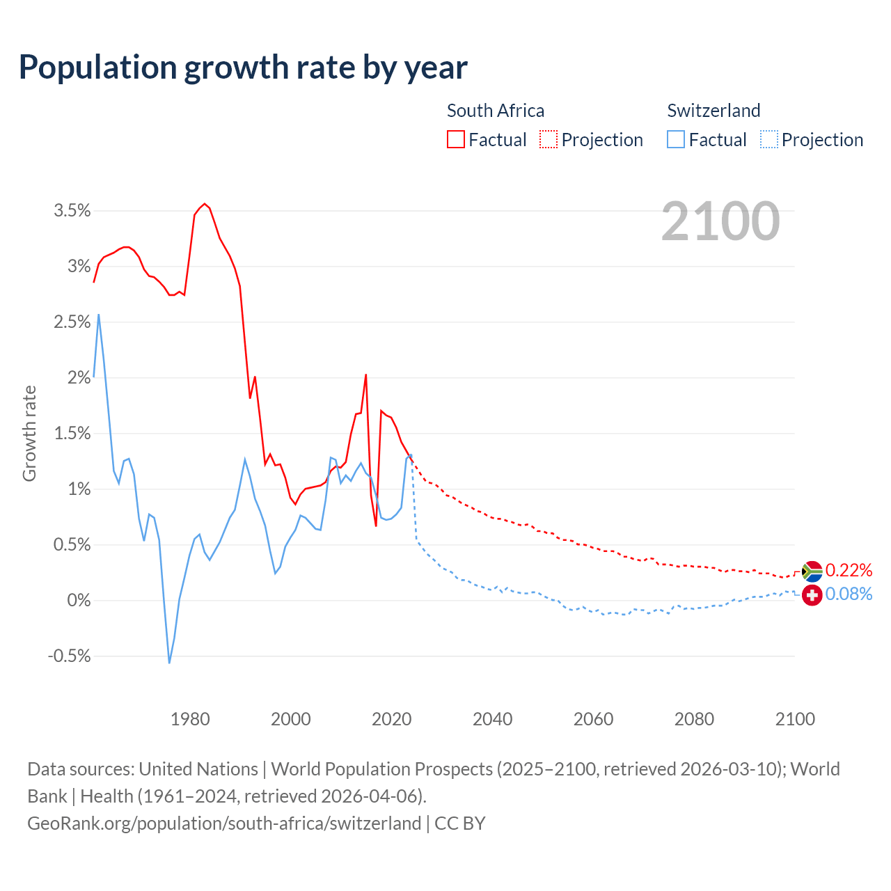 - For the last 10 years, South Africa has had an average growth rate of +1.44% per year vs +0.98% in Switzerland.
