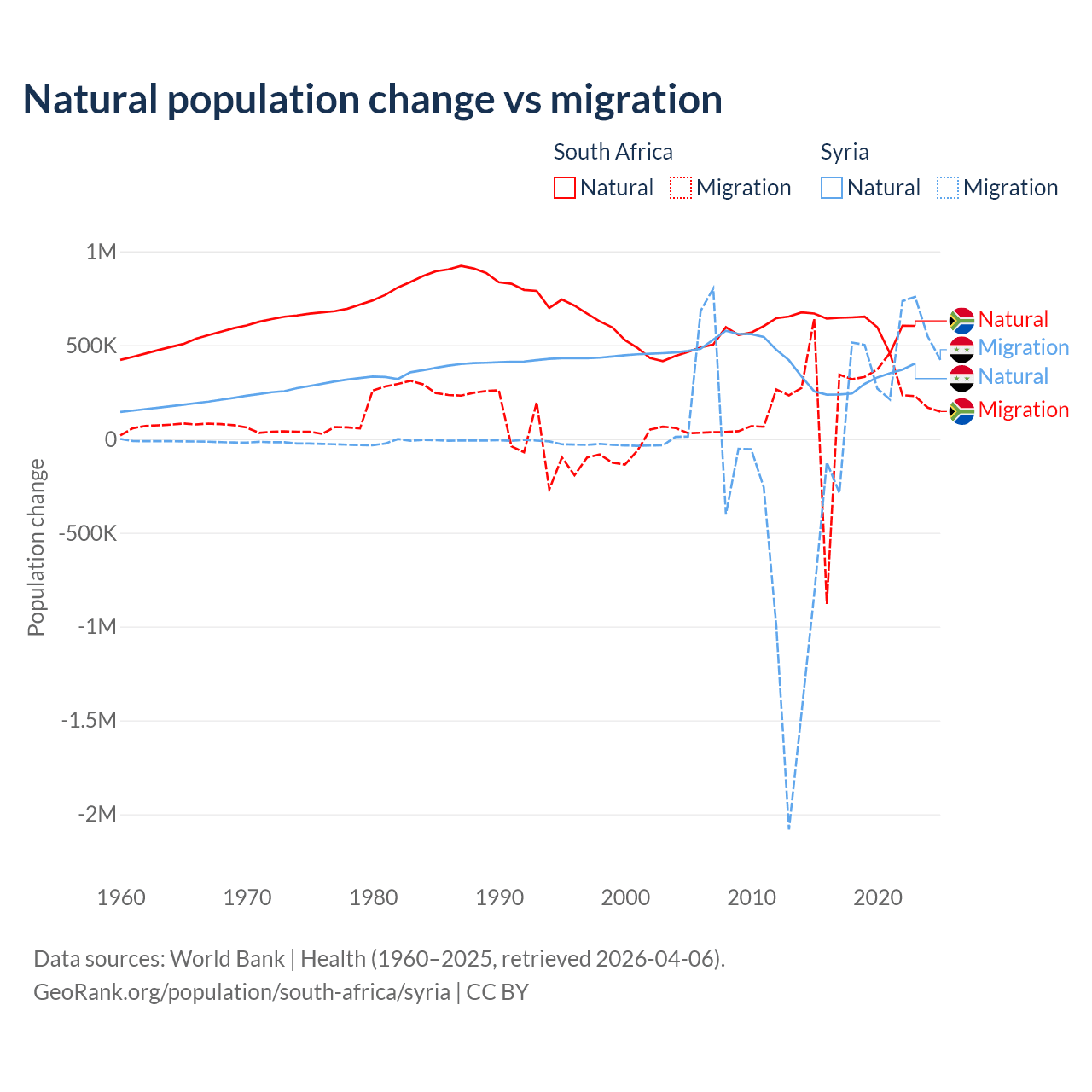 Over the last 10 years, 72.8% of the population change in South Africa is from natural causes (a gain of 6,190,027 people) and 27.2% is from migration (a gain of 2,316,795 people). In Syria 91.3% is from natural causes (a gain of 3,047,621 people) and 8.72% is from migration (a gain of 291,069 people).