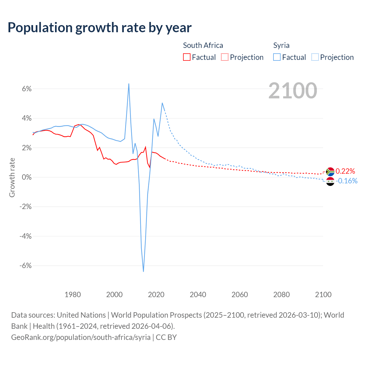 - For the last 10 years, South Africa has had an average growth rate of +1.44% per year vs +1.25% in Syria.