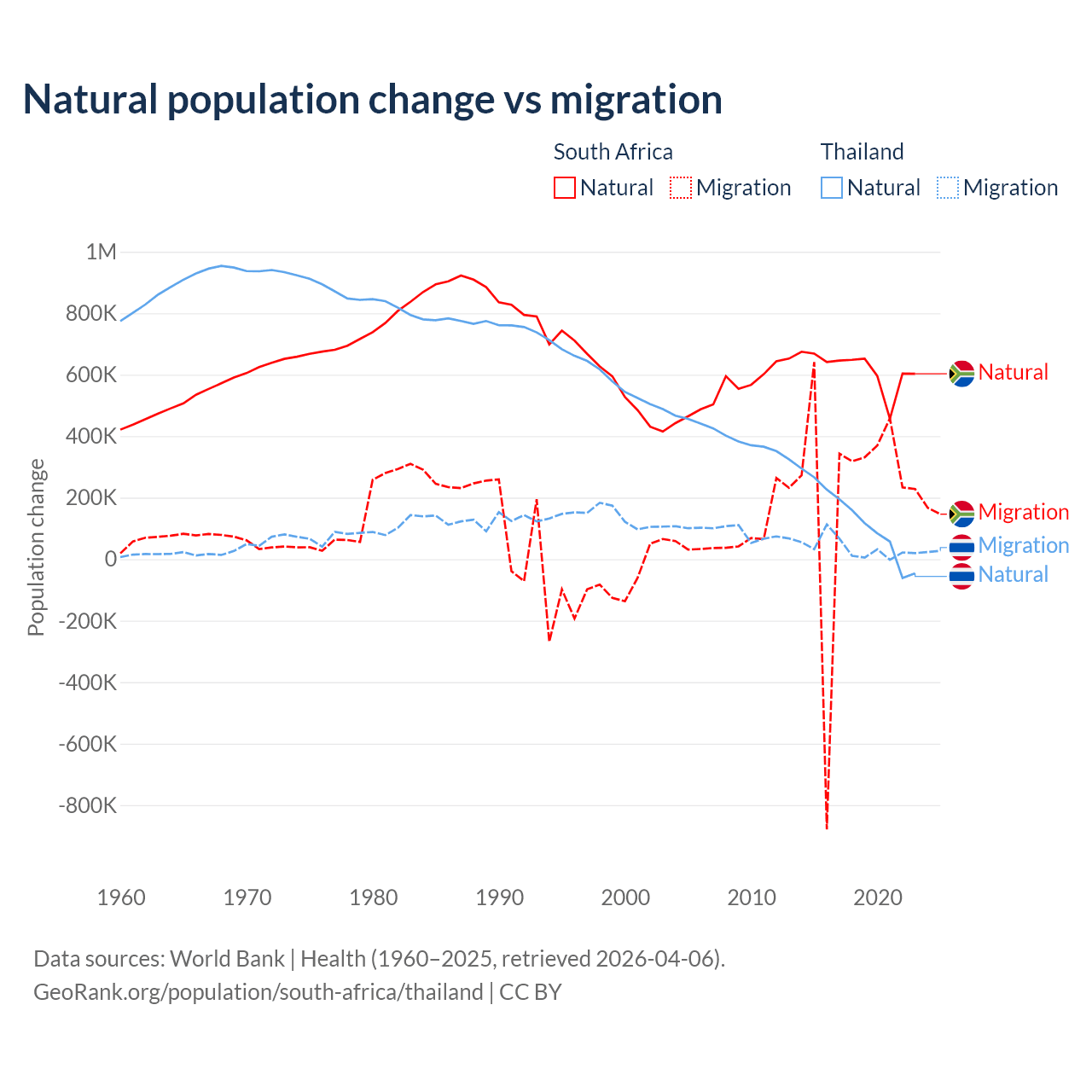 Over the last 10 years, 72.8% of the population change in South Africa is from natural causes (a gain of 6,190,027 people) and 27.2% is from migration (a gain of 2,316,795 people). In Thailand 78.4% is from natural causes (a gain of 1,292,528 people) and 21.6% is from migration (a gain of 355,361 people).